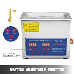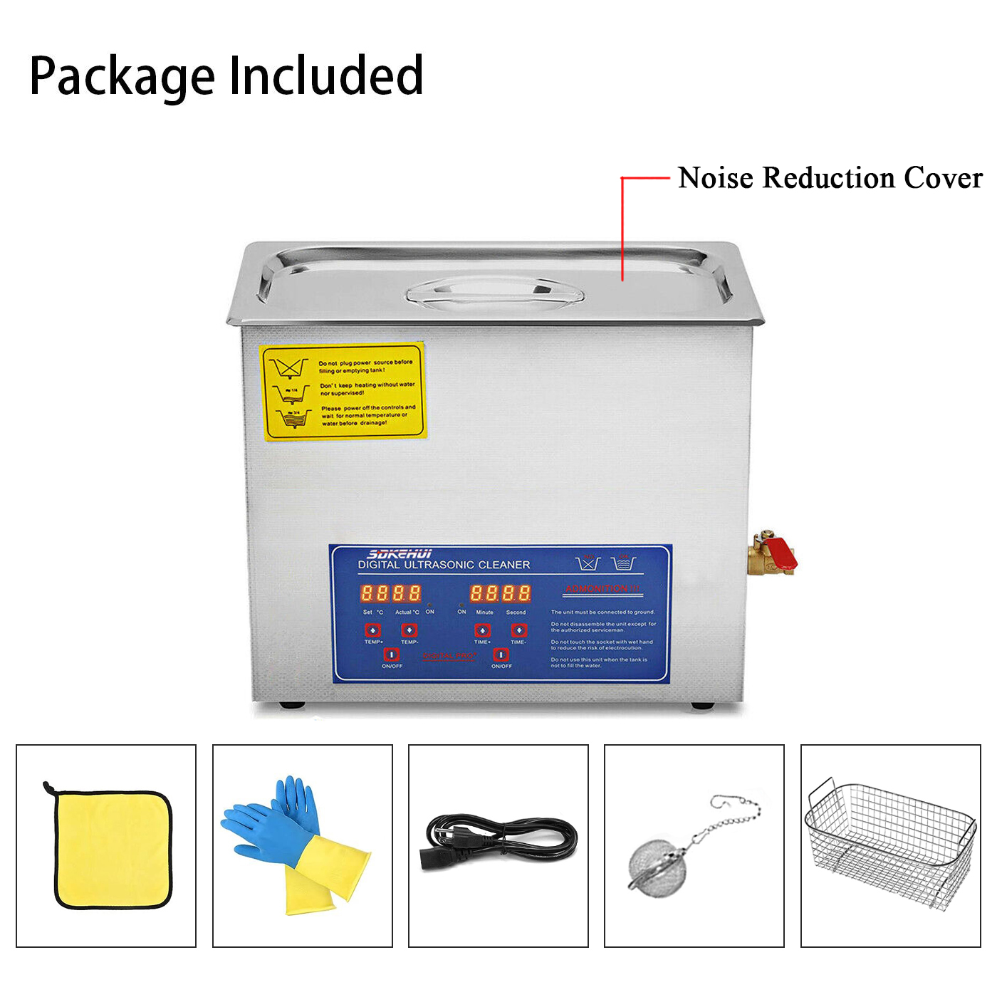 This ultrasonic parts cleaner is made from 304 stainless steel with a noise reduction lid and built-in handles on both sides, designed for durable use and easy cleaning.