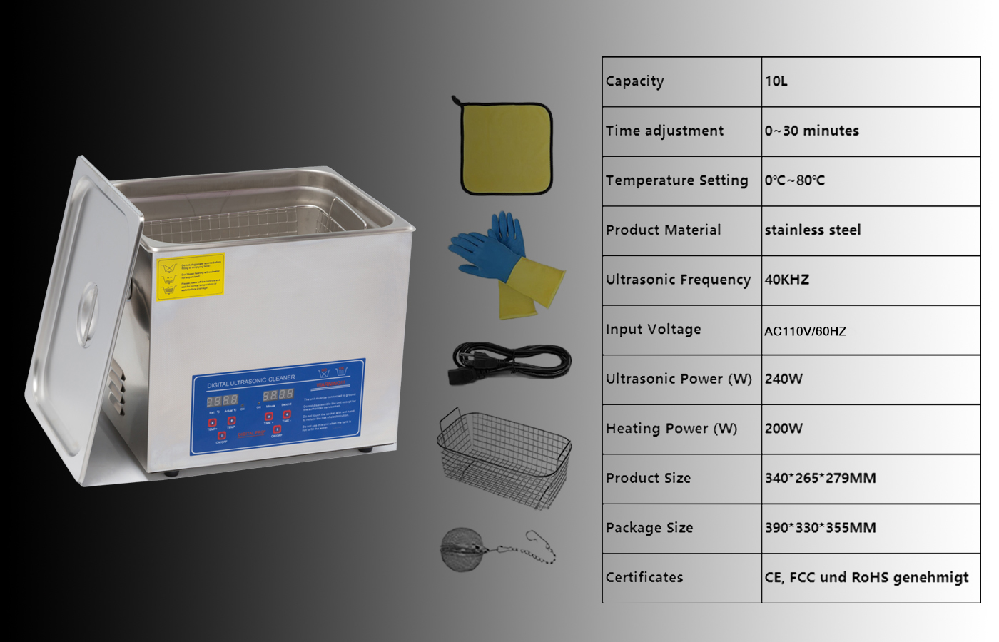 Our cleaning machine comes with a stainless steel cleaning basket, a ball-shaped jewelry cleaning basket, a cleaning cloth , a pair of rubber gloves,a Power cord and a Instruction Manual.
