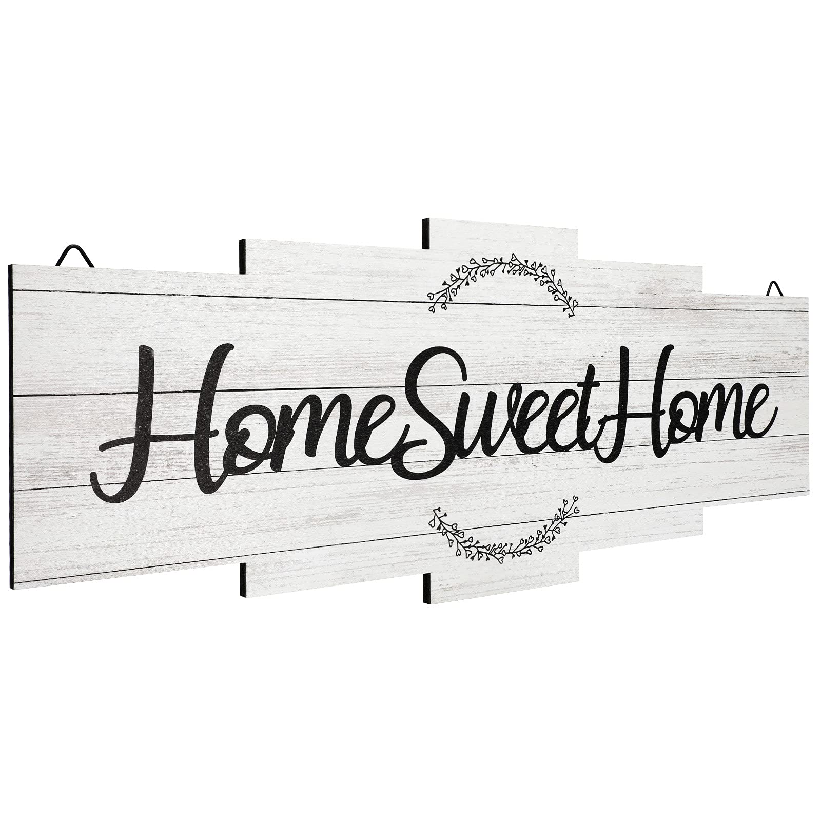 Features: Featuring rustic and [Home Sweet Home] letters printing, this sweet home sign can be sent to your boyfriend or girlfriend, wife or husband, daughter or son, teacher or others you love as a sweet gift on birthday, New Year, Thanksgiving, etc. The back of this wall art sign is intimately designed with 2 hooks, which is suitable for living room, bedroom, kitchen, office, hotel, dining room, bathroom, bar decor, etc., which will produce a cute decoration effect and make your home look warm and elegant. Specifications: Material: wood Size: approx. 40 x 16 cm/ 15.7 x 6.3 inches Thickness: approx. 5 mm/ 0.2 inches Color: as pictures shown Package includes: 1 x Home sweet home sign Warm notes: Please allow slight size errors due to manual measurement. The colors may be slightly different from pictures due to different screens.