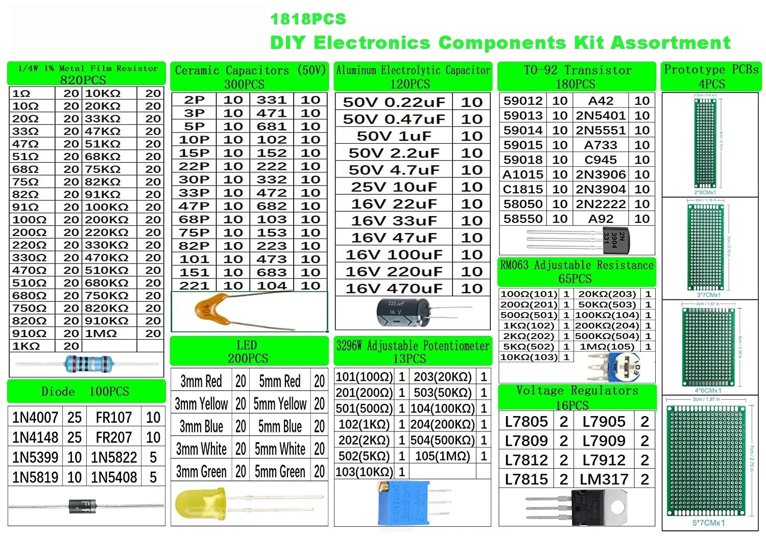 1.This kit Includes 1818pcs of the most important and useful electronic components. Would be a great gift for a family member or friend who tinkers with electronics.