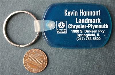 Check it out...Here's a very cool approximately 1 1/2" wide by 3" long blue & white colored soft flexible rubber & metal keychain from a 1970-80s Era Chrysler / Plymouth Motor Car dealership in Springfield, Illinois-Keychain reads: "Kevin Hannant Landmark Chrysler Plymouth 1900 S. Dirksen Pky. Springfield, Il." with the phone number inset on front & is blank on back-The keychain is in lightly-used condition with wear expected from age and normal use-(See photos below for clarification) How many of these survived? This an ORIGINAL item, NOT A REPRODUCTION item! Postage information is listed at the bottom-$ 4.95 postage is required.