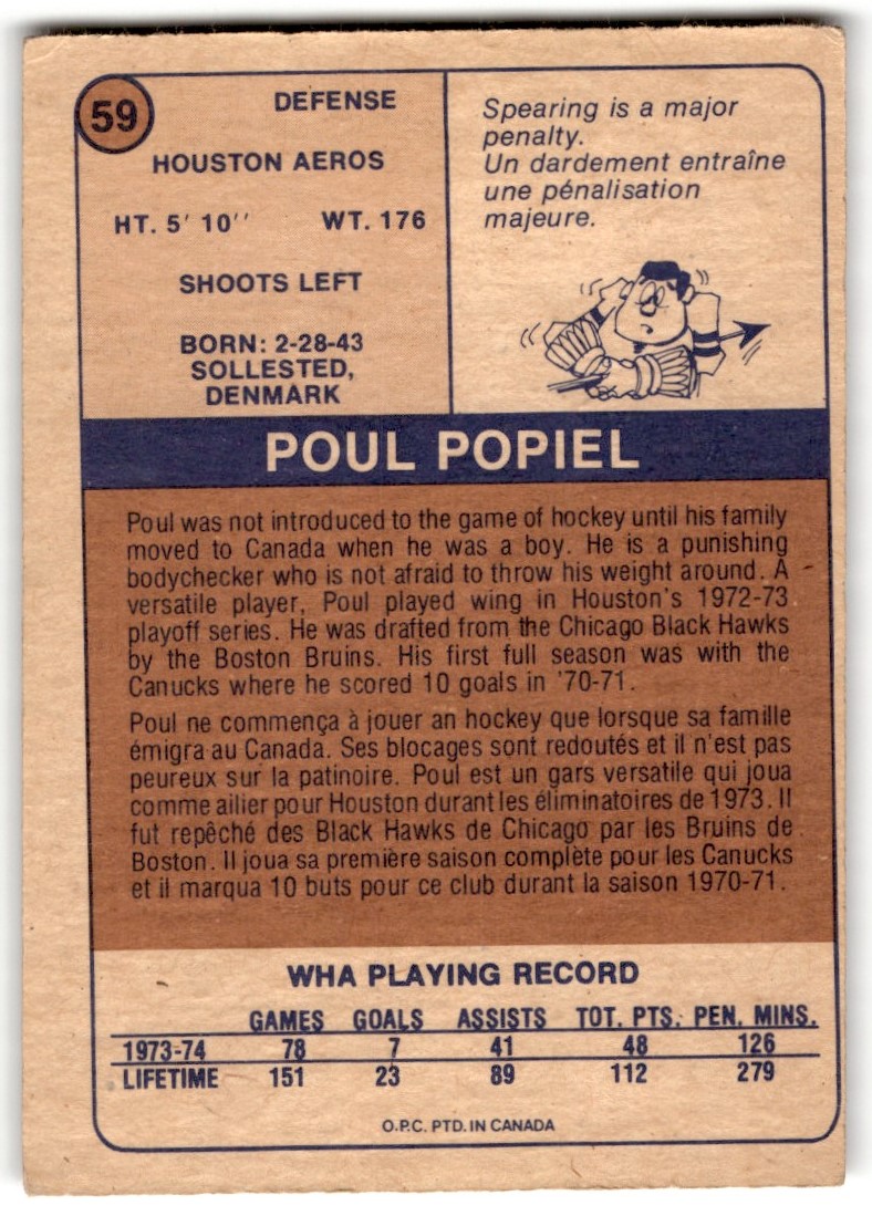 | Poul Popiel 1974-75 O-Pee-Chee WHA #59 Houston Aeros |
