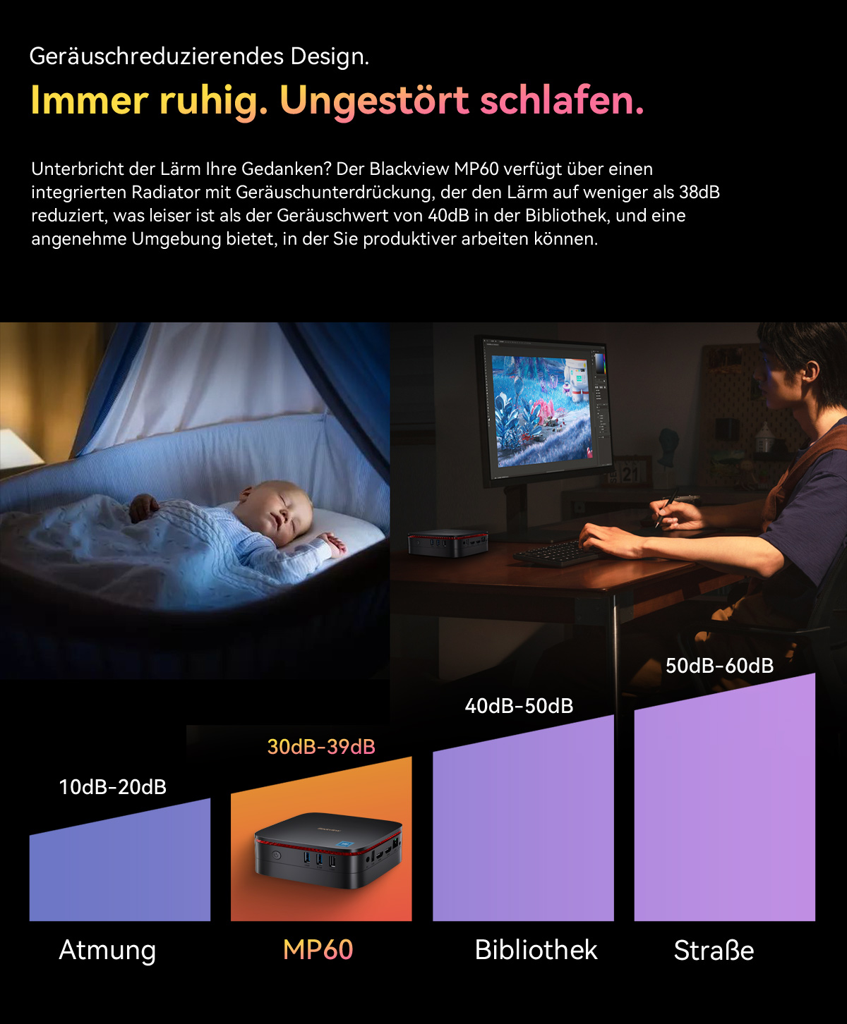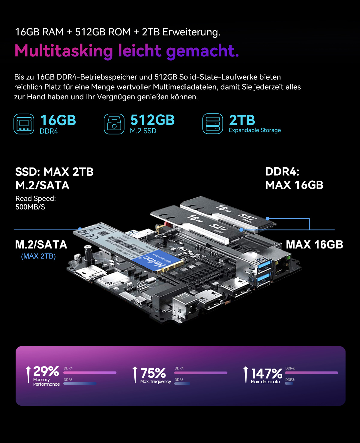 【16 GB RAM, 512 GB/1 TB SSD und bis zu 2 TB 2,5-Zoll-SATA-Erweiterung】 Der Blackview MP60 N150 Mini-PC verfügt über 16 GB Arbeitsspeicher und eine 512 GB/1 TB Hochgeschwindigkeits-SSD, die einen reibungslosen und verzögerungsfreien Betrieb ermöglicht, egal ob bei Multitasking-Büroarbeiten oder Unterhaltung und Video. Die Reaktionszeit von Sekunden beim Booten und das schnellere Laden von Software verbessern die Arbeitseffizienz erheblich, sodass Sie sich vom lästigen Warten verabschieden können. Er unterstützt außerdem die Erweiterung einer 2,5-Zoll-SATA-Festplatte! So müssen Sie die Festplatte nicht mehr häufig reinigen, und wertvolle Informationen und Hobbys bleiben erhalten.