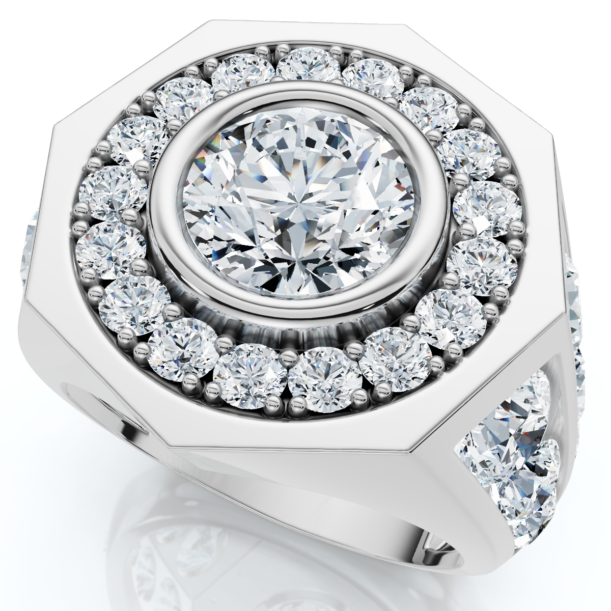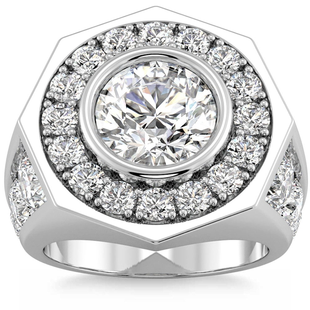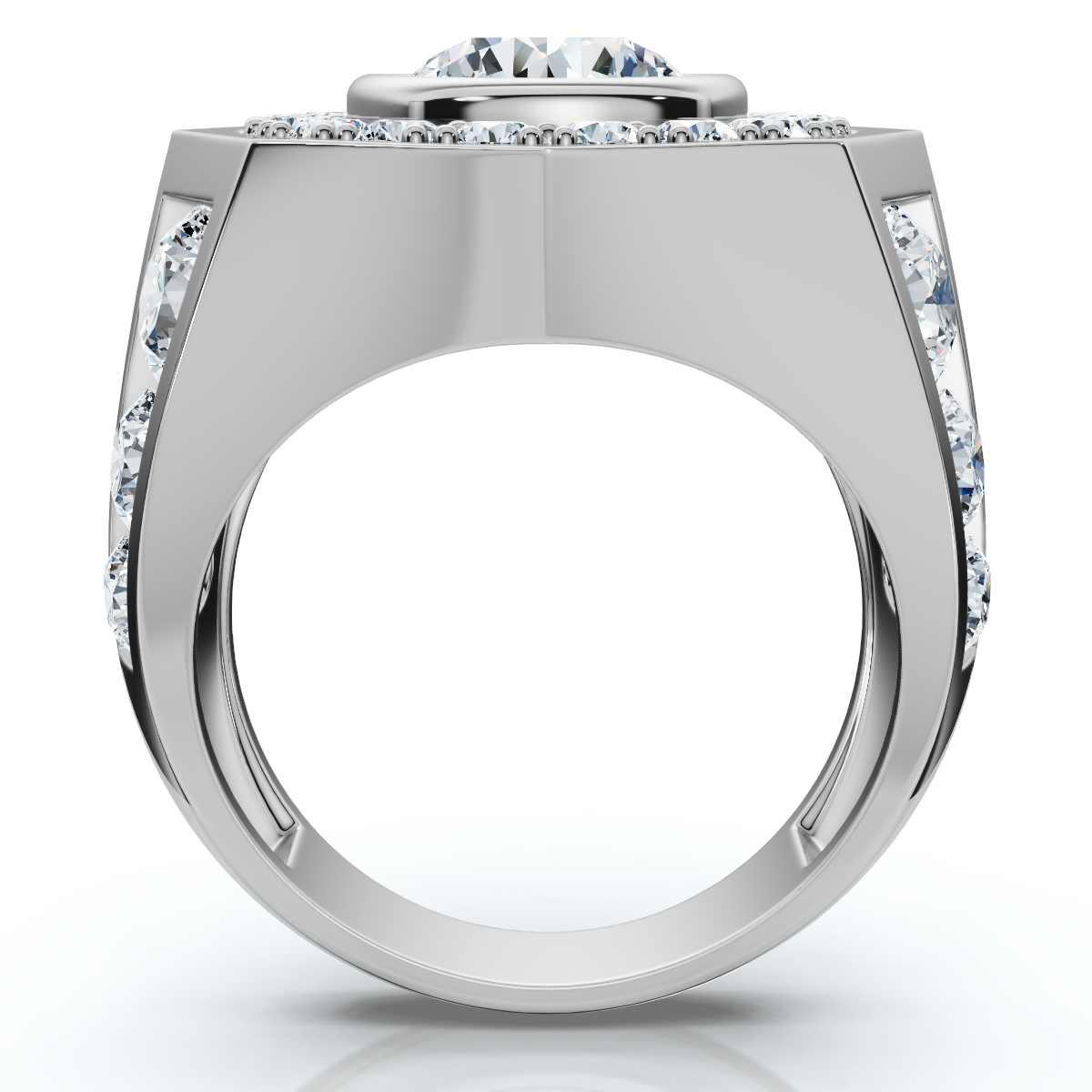 This high quality mens ring features a large three carat round cut diamond accented with larger side stones. All diamonds are set in solid 10k high polished gold.