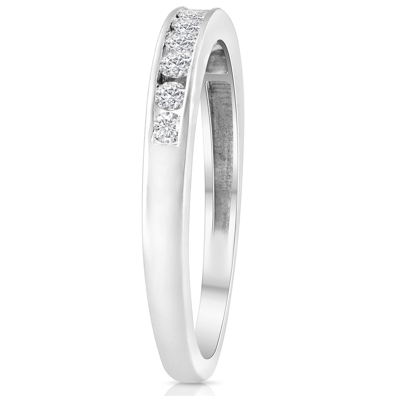 Womens ring features 9 round cut diamonds channel set in 10k white gold. This is the perfect diamond ring to stack with other bands, wear alone, or compliment your engagement ring. Its as classic and traditional as it gets.