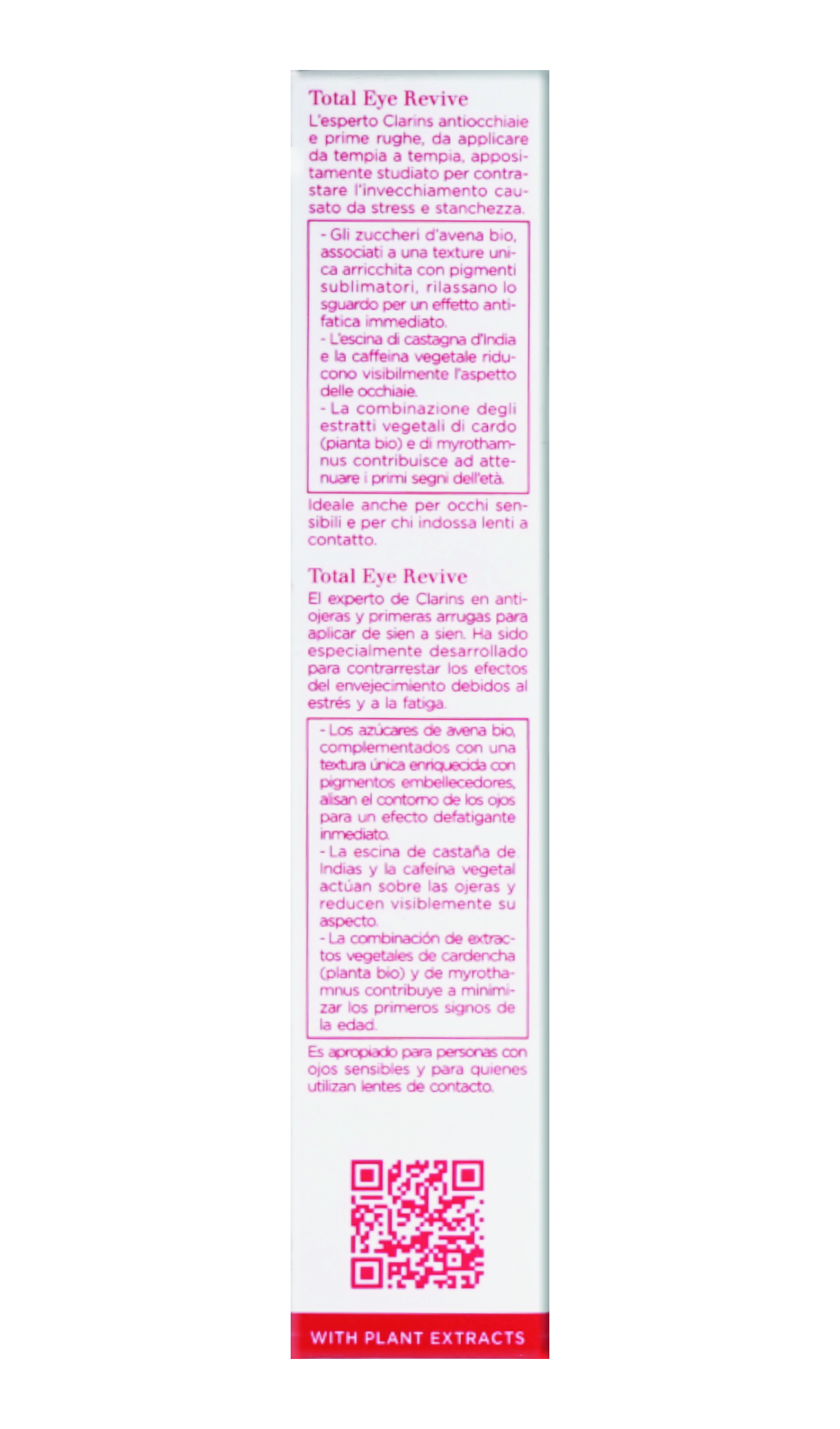 Clarins Total Eye Revive Eye Cream Gel for All Skin Types is formulated to address several common eye area concerns. This product helps to reduce the appearance of dark circles and puffiness, smooth fine lines, and brighten the eyes. It features a blend of natural ingredients like antioxidant rich Teasel and Myrothamnus extracts, which are said to minimize signs of stress and fatigue visibly. These ingredients work together to firm up the skin around the eyes, hydrate, and brighten the eye contours, making it suitable for all skin types including sensitive skin due to its gentle formulation. How to use: Apply daily, both in the morning and in the evening, applying it gently around the eye contour area with a focus on areas prone to wrinkles and signs of fatigue. Ingredients include Glycerin, Cellulose, Caffeine, Oat Kernel Extract and Citric Acid. Clarins skincare products are made cruelty free, vegan, dermatologist tested, and with natural plant extracts.