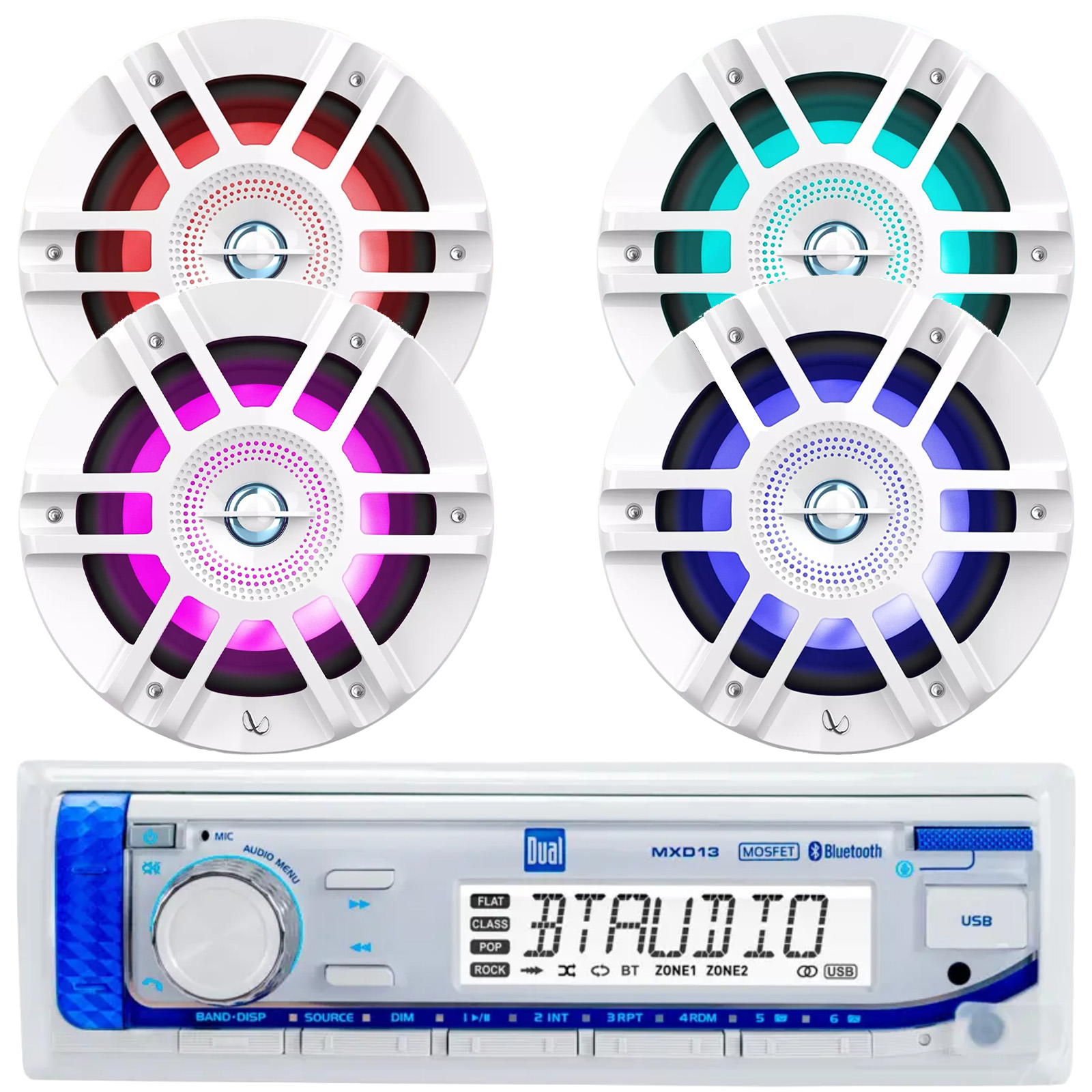 PACKAGE BUNDLE INCLUDES: Dual Electronics MXD13 Single-DIN Marine Bluetooth USB/AUX MP3 AM/FM Radio Digital Media Stereo Receiver, 4x Infinity KAPPA 6120M 6.5" 300 Watts Max Power 2-Way Coaxial RGB LED White Boat Speakers