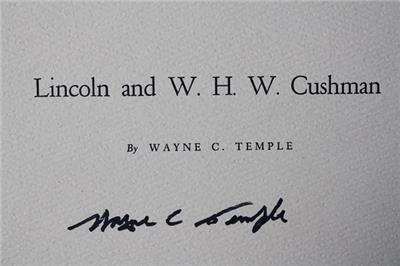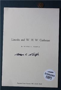 Check it out...Here's a classic 7" wide by 10" tall multi-paged booklet titled "Lincoln and W.H.W. Cushman" by Wayne C. Temple Springfield, Illinois that has been 100% HAND-SIGNED / AUTOGRAPHED by author Dr. Wayne C. Temple on front-(See bio below)-The 1966 booklet is signed by Doc in black ink under his name on the front cover-The booklet itself is hard to find and is a great read, let alone signed by the subject! How fun is that? Good condition with some minor damage in upper left corner (See photos below for clarification)-A very nice item ready for display-