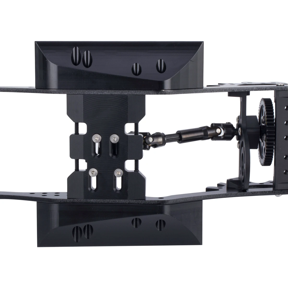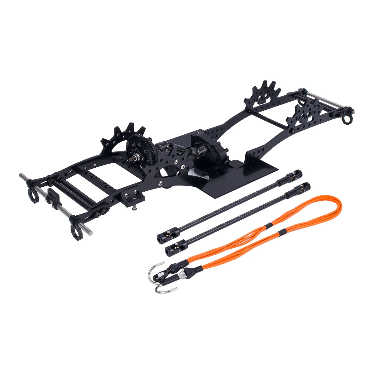 Includes basic chassis accessories (beam, 5 colored carbon fiber support tubes, front and rear bumpers, cable guides, trailer hooks, dual steering mounts, Panhard mounts, transfer box, front motor mount, gearbox drive shaft, 2 cuttable long drive shafts, Delrin bottom plate, Delrin side pedals, and an elastic hook car shell fixing rope)