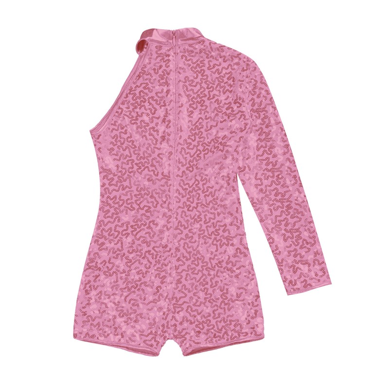 The leotard with single long sleeve and round collar, shiny sequins texture decorated in allover, boxer bottom design.