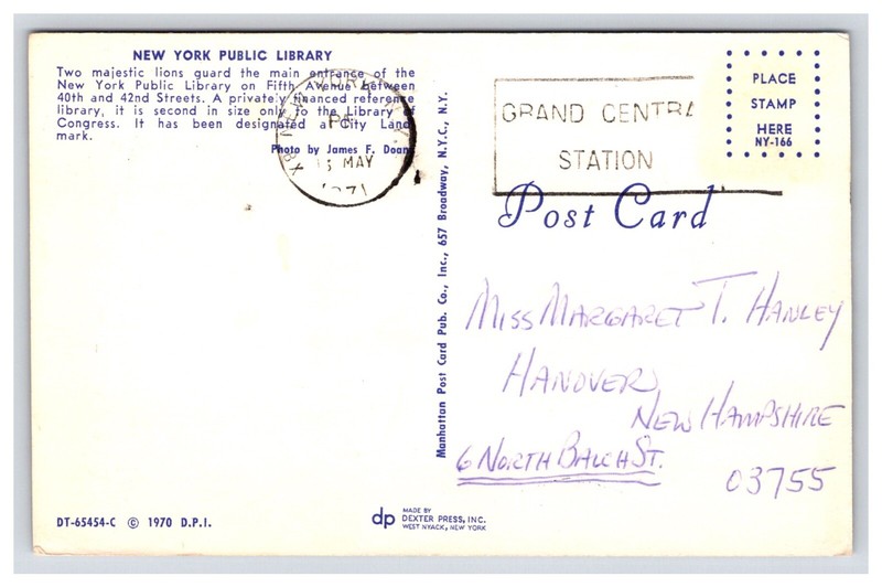 You are looking at a: NY 1971 New York Public Library, New York, New York postcard that is posted. This postcard is in great shape for its age and going through the mail. This postcard was sent from New York City, New York to Hanover, New Hampshire on May 15, 1971. The stamp is missing. This postcard has a 1970 copyright.