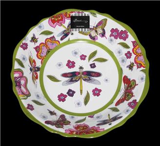 Baci Milano Large Melamine Scalloped Serving Bowl. Depicts dragonflies, butterflies, bumblebees, flowers, etc. Measure 13-1/2" wide x 2-3/4" tall. Dishwasher safe. Nice quality, heavy and durable.