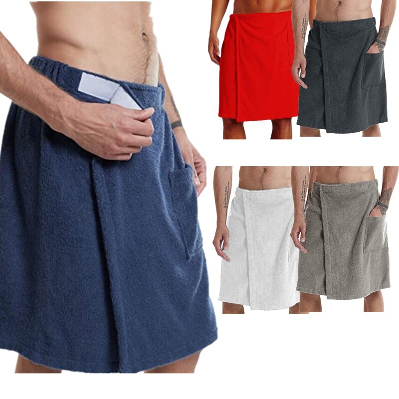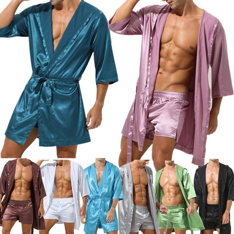 Mid-length bathrobe designs with long sleeve, open front, self-tie belt, side pockets, solid color and nice edges, which is perfect for men.