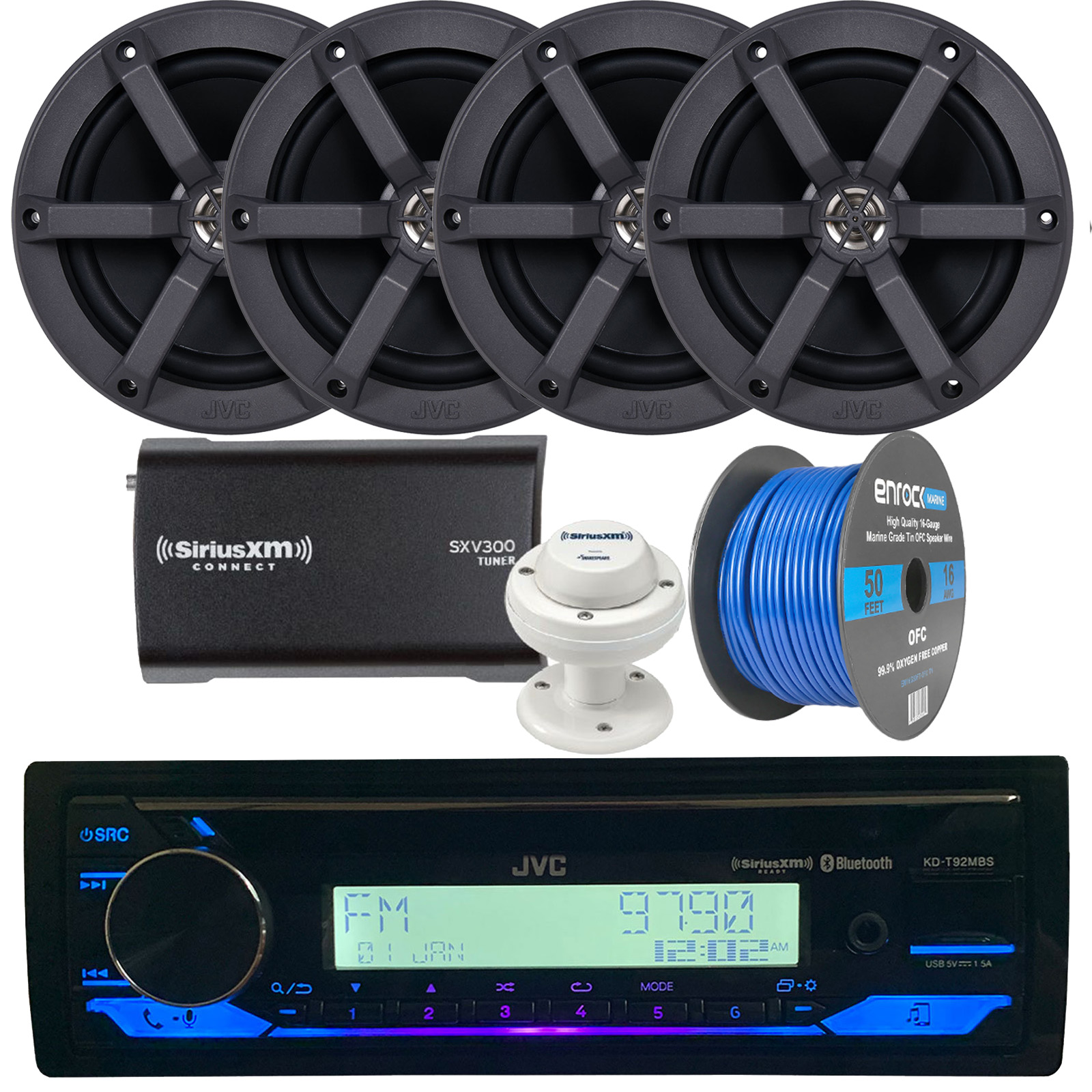 PACKAGE BUNDLE INCLUDES: JVC KD-T92MBS Single DIN Marine MotorSports Bluetooth USB AUX AM/FM Radio Stereo SiriusXM Ready CD Player Receiver, 4x JVC CS-MS620 6.5" 2-Way 100 Watts Max Power Marine Speakers (Pair), SiriusXM SXV300M1 Satellite Radio Tuner Bundle with SRA50 Marine/RV Antenna, Enrock Marine Grade Spool of 50 Foot 16-Gauge Tinned Speaker Wire.