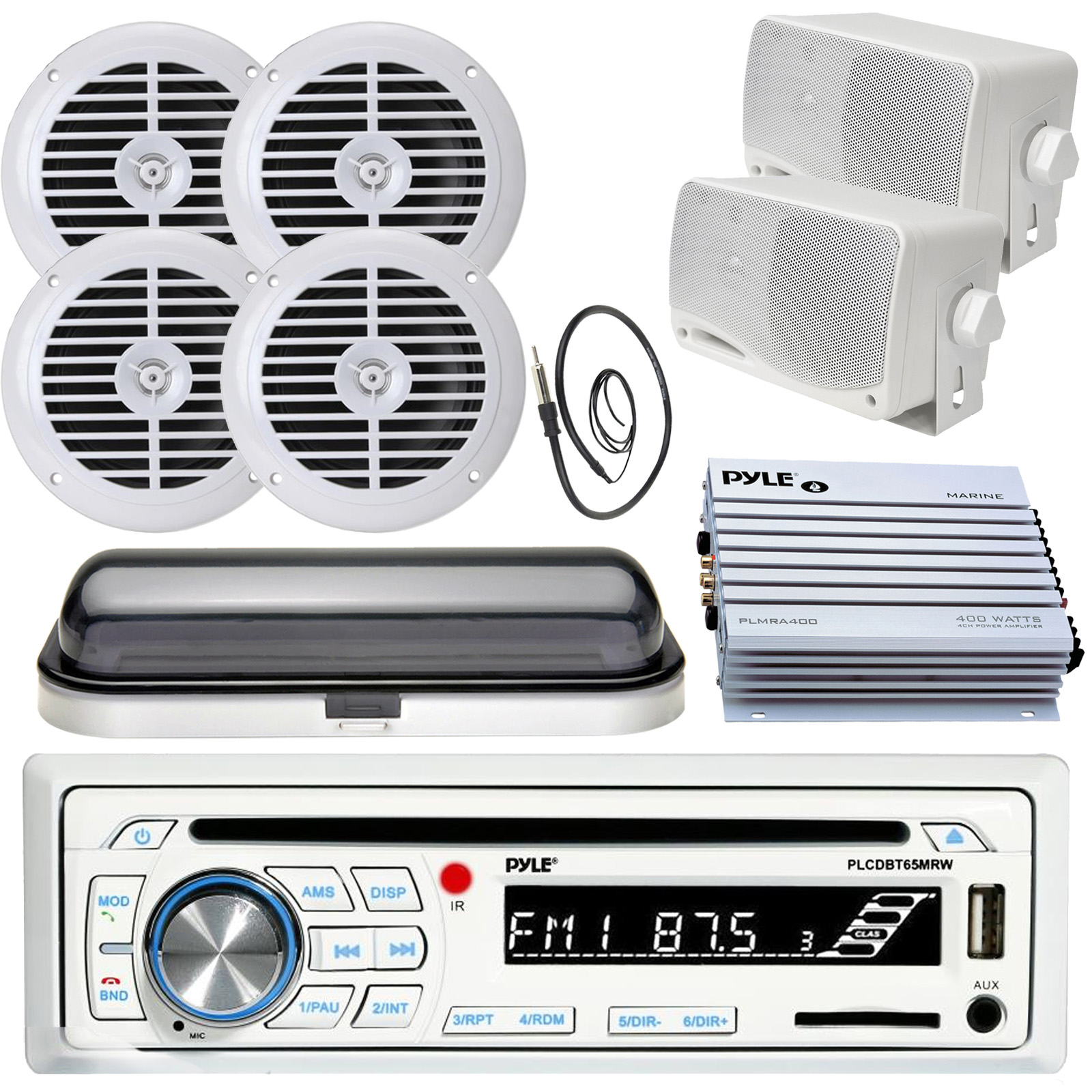 Package Includes: 1 X Pyle PLCDBT65 Bluetooth In-Dash Stereo Radio Headunit Receiver, 2 X Pair PLMR67W Pyle 6 1/2'' Dual Cone Waterproof Stereo Speaker System (White), 1 X PLMRA400 Pyle 4 Channel 400 Watt Waterproof Marine White Amplifier, 1 X Pair PLMR24 Pyle 3.5'' 200 Watt 3-Way Weather Proof White Mini Box Speakers, 1 X PLMRCW1 Pyle Water Resistant White Radio Shield, 1 X EKMR1 Enrock Marine Black Wire Antenna