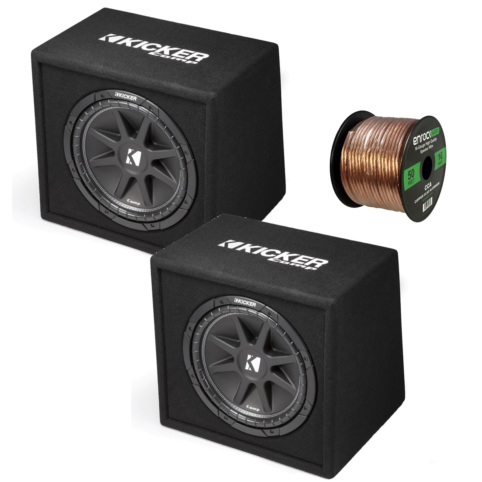 • PACKAGE BUNDLE INCLUDES: Pair (QTY 2) of Kicker 43VC124 12" 300 Watt Peak Power 4-Ohm Black Car Audio Subwoofer Enclosure with 50 feet 16 Gauge Speaker Wire