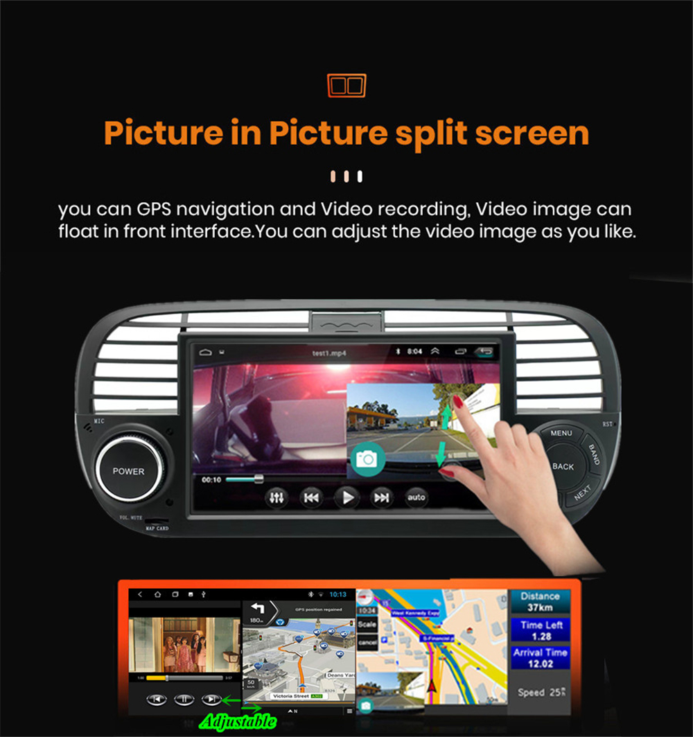 Display | - Touch Screen: Yes - Resolution: 1024*600 - Capacitive or Resistance Screen: Capacitive - Built-in Clock and Calendar: Yes, show real time and can use network-provided time - Main Menu Status Bar display: Can be changed to Music/Radio/BT-Stereo Player and Clock/Date/Week - Change Apps-Icon Position: Yes - Picture in picture split screen:Yes Split screen feature enables you to use two applications at the same time. For example running Navigation with Music Player or Radio with Navigation at the same time. Optimum convenience for both the driver and passengers. |