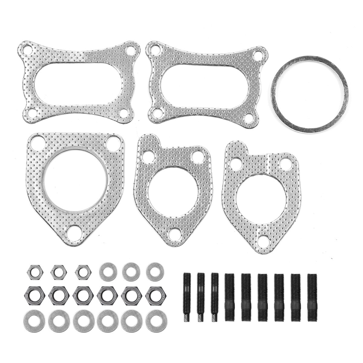 Remove the engine support bracket.Remove the catalytic converter.Line up the new catalytic converter.Loosely install one top nut to secure the catalytic converter.