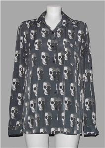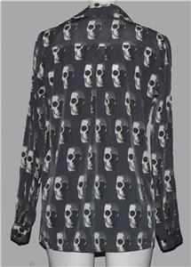 Liberty Love Shadowed Skulls Button Blouse / Shirt. Adjustable roll tab sleeves. Left chest pockets. Machine wash, 100% polyester. Women's M. Approx. measurements: