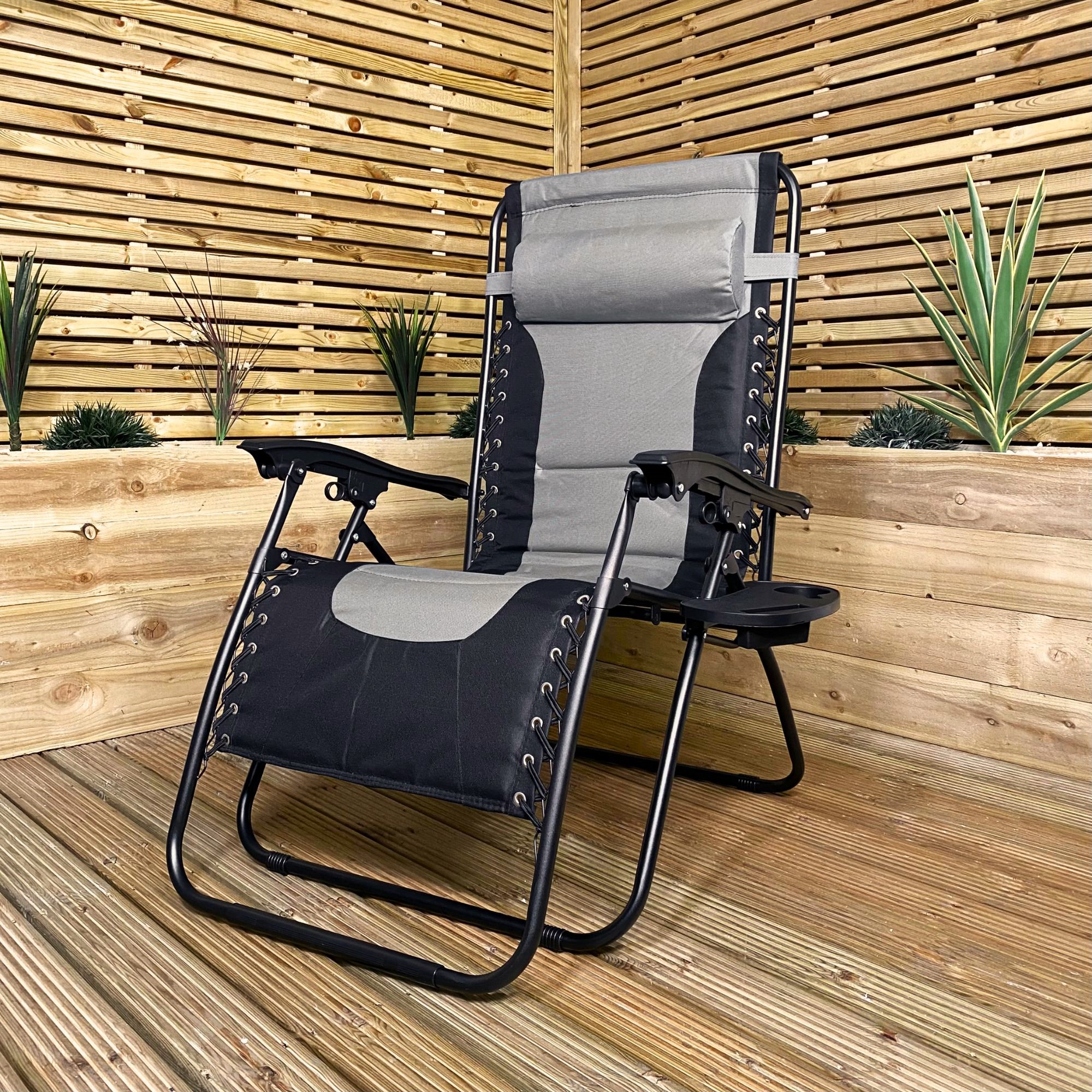 Factory Seconds: These gravity chairs have imperfections on the armrest such scratches or marks. Perfect for the garden or patio these reclining chair loungers are made with a sturdy powder coated Black metal frame with a durable Grey and Black padded fabric. The chair loungers feature a removable pillow on the headrest for extra support and comfort. The design is operated by weight alone, simply take a seat and lie back as the back lowers your feet will raise and lift you into a comfortable reclining position and the natural movement of sitting up will prompt the chair to move with you. These chairs also features a detachable cup holder tray that fixes onto the side and a lock mechanism for under the arm rests to fix the position of the chair. When not in use these chair are easily folded down to a compact size to be stored away. Maximum user weight 150kg. Fully reclined Dimensions Length 150cm Height 89cm Seat W: 58cm Seat H 42cm Total W 84cm (including cup holder) Arm rest L 54cm Arm rest W 6cm