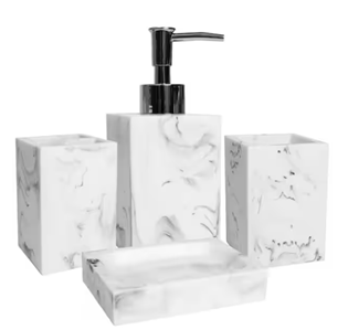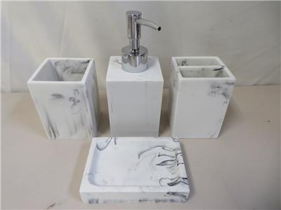 4-piece set includes: 1 soap/lotion dispenser, 1 tumbler, 1 toothbrush holder, 1 soap dish