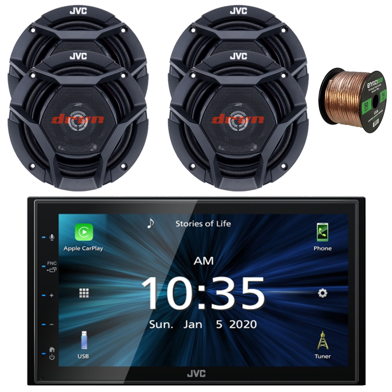 • PACKAGE BUNDLE INCLUDES: JVC KW-M56BT 6.8" Capacitive Touch Monitor Double-DIN Bluetooth USB/MP3 AM/FM Radio Digital Media Stereo Receiver, 4x JVC Mobile CS-DR1721 drvn DR Series 6.75" 300 Watts Max Power 2-Way Shallow-Mount Coaxial Speakers, 50 Feet 16 Gauge Speaker Wire