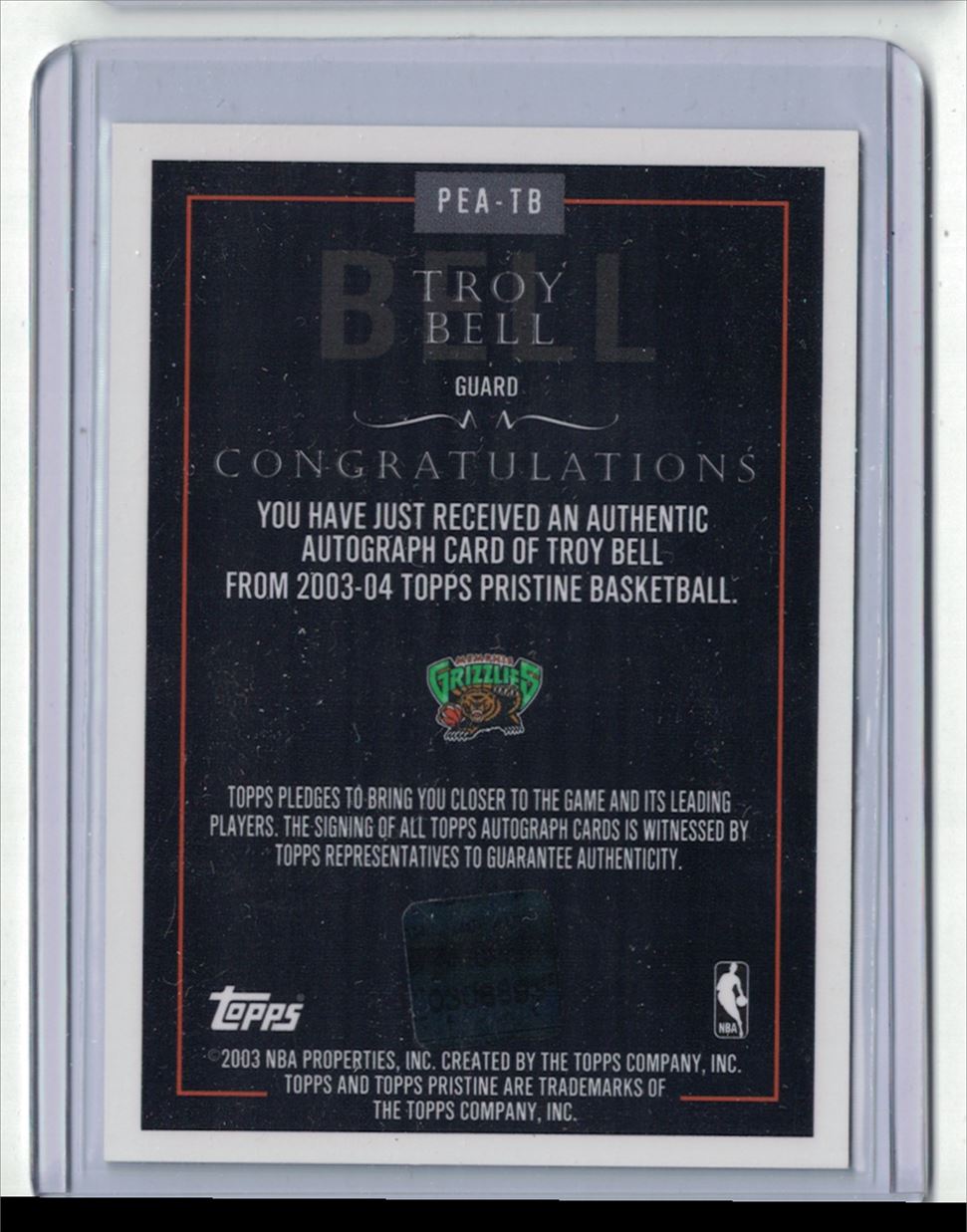 | Description: | Troy Bell | | Category: | Basketball | | Year: | 2003 | | Product: | Topps Pristine | | Team: | Memphis Grizzlies | | Memorabilia: | Autograph | | Special: | | | Dimensions: | 4" x 3" |