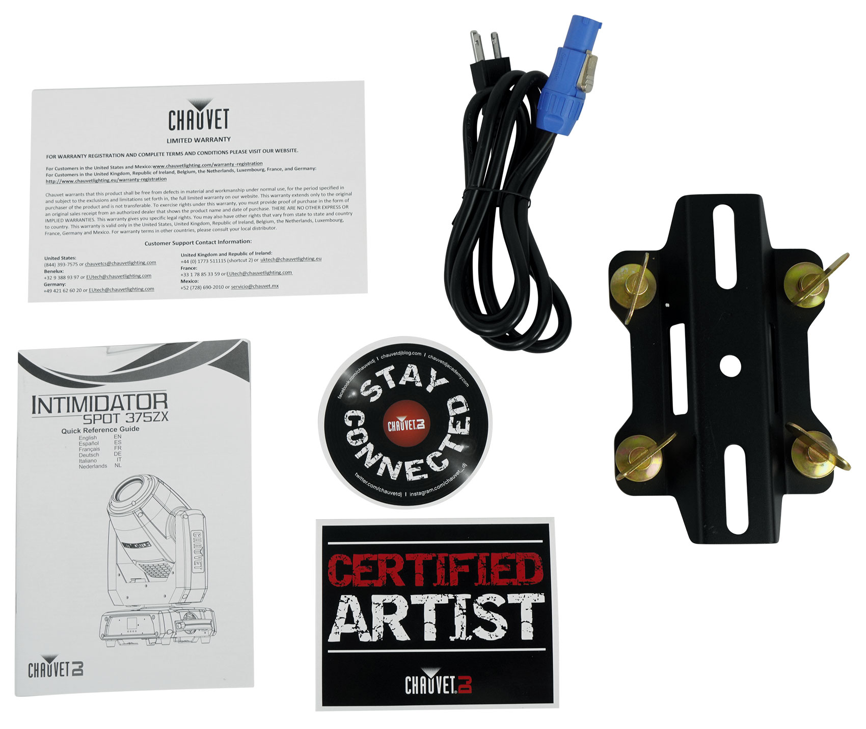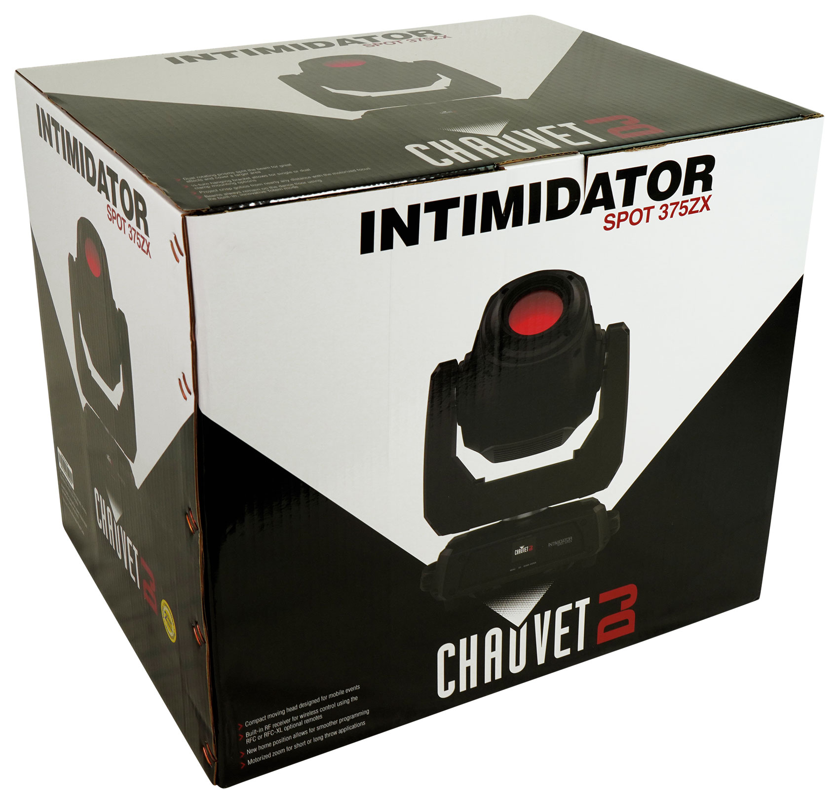 Bright and bold! Be your best with X! Intimidator Spot 375Z X is a feature-packed compact moving head designed for large events. 200 watts of lighting power are just the start of the robust and convenient options on board. Along with a color wheel updated with CTO technology, Intimidator Spot 375Z X has a built-in RF receiver for wireless control allows use of the RFC or RFC-XL optional remotes putting unprecedented moving head control options in the palm of your hand without having to aim the remotes at the unit. And Intimidator Spot 375Z X is not only energized, it's motorized! Motorized zoom is on board and is perfect for short or long throw applications and project crisp gobos from nearly any distance with the motorized focus too! A brand new home position allows for smoother programming, eliminating the need for full head rotation to start lighting looks. Dual rotating prisms split the beam for great effects and cover a larger area. Set, save, and recall 1 scene manually, directly from the full color LCD display.