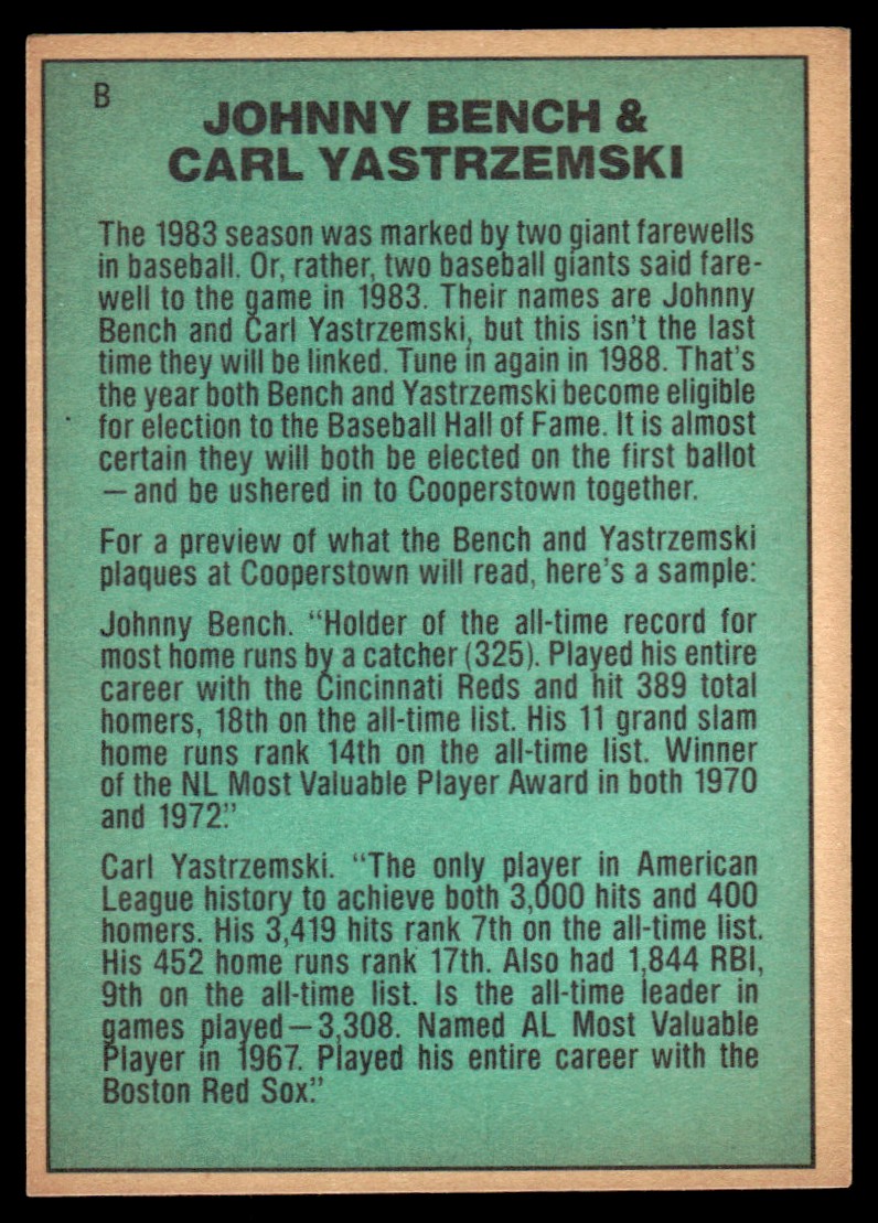 | 1984 Donruss Baseball Johnny Bench Carl Yastrzemski Living Legends #B |