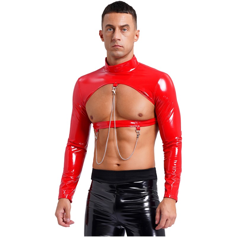 Men’s lingerie crop top designs with stand collar, long sleeve, back zipper closure and extensive hollow out in front, showing chest muscle.
