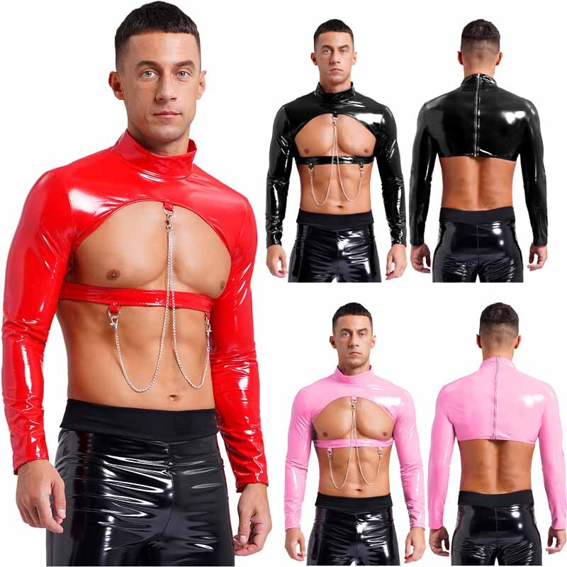Men’s fashion shiny faux leather crop tank tops, sleeveless and backless.