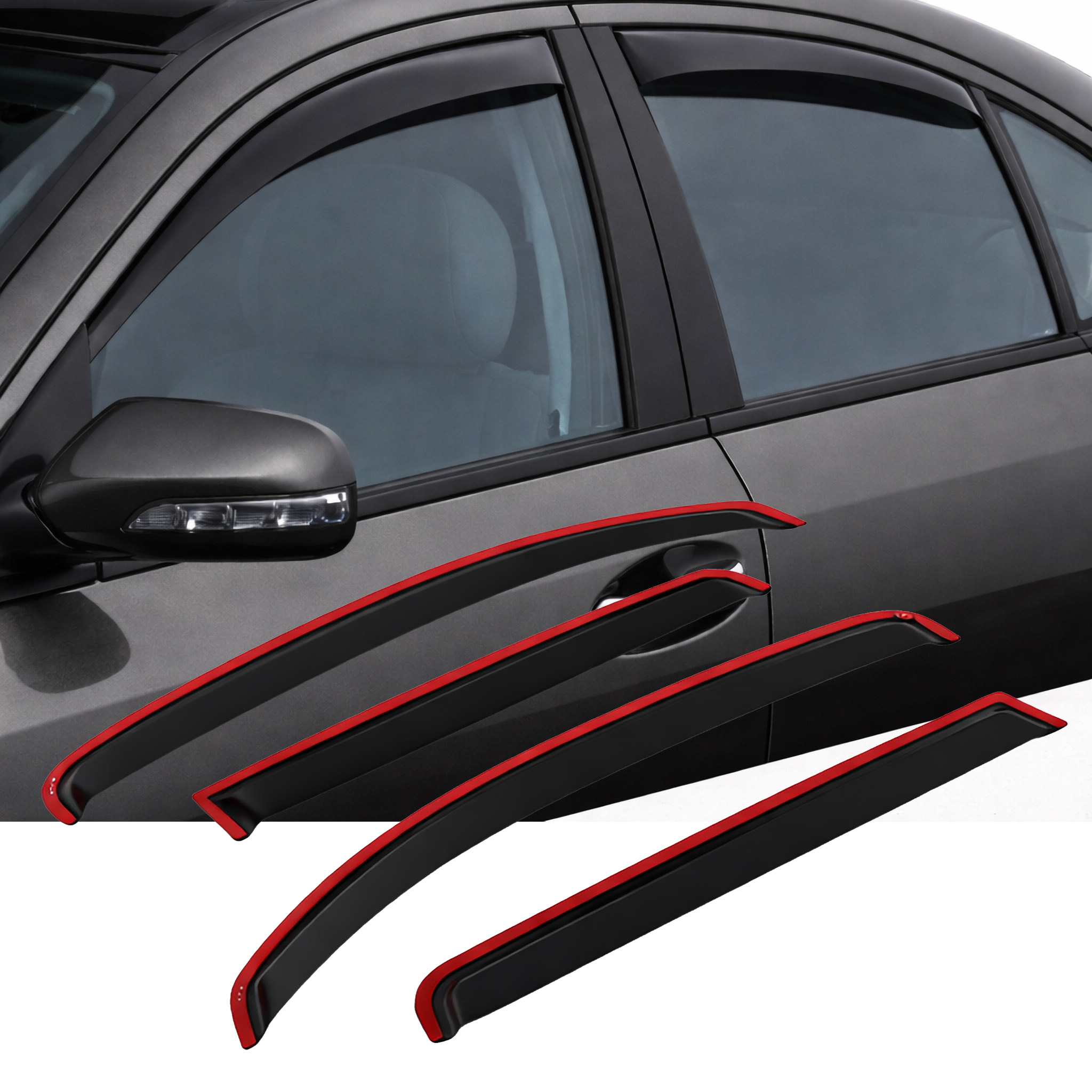 Custom-fit rain guard window visors designed specifically for compatible vehicles. The dark smoke finish helps reduce interior heat buildup while allowing fresh air circulation during rain or light weather, letting windows remain slightly open for ventilation.
