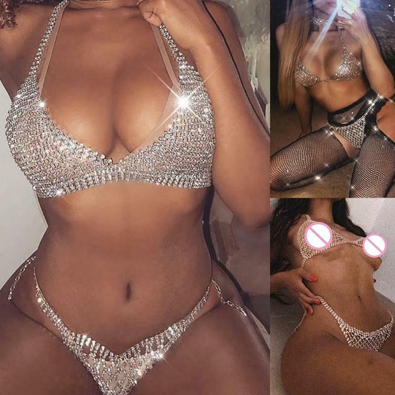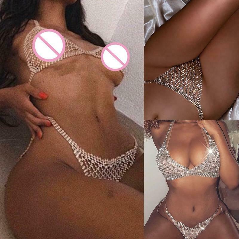 Women Sexy Glitter Rhinestone Bra Panties Set Crystal Chain Bikini Underwear