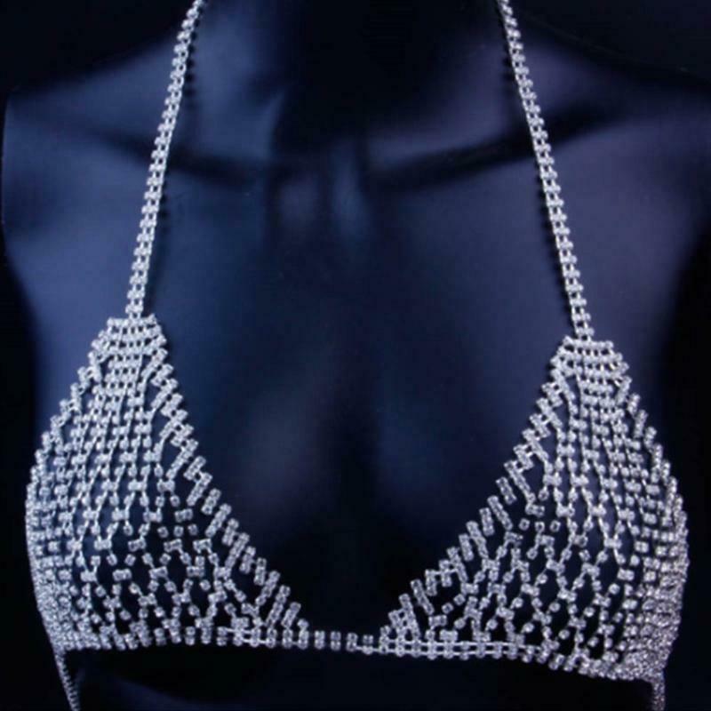 Shiny rhinestone bra and panties set: extended chain on the bra and briefs, which could be adjusted to fit the women.