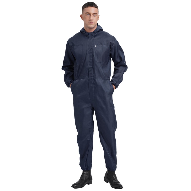 Men’s work overall designs with drawstring hood, long sleeves, front half zipper, long pants and big pockets, one-piece coverall.