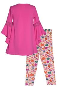 - Fuchsia pink jersey knit with matching bell sleeve ruffles and lace trim
