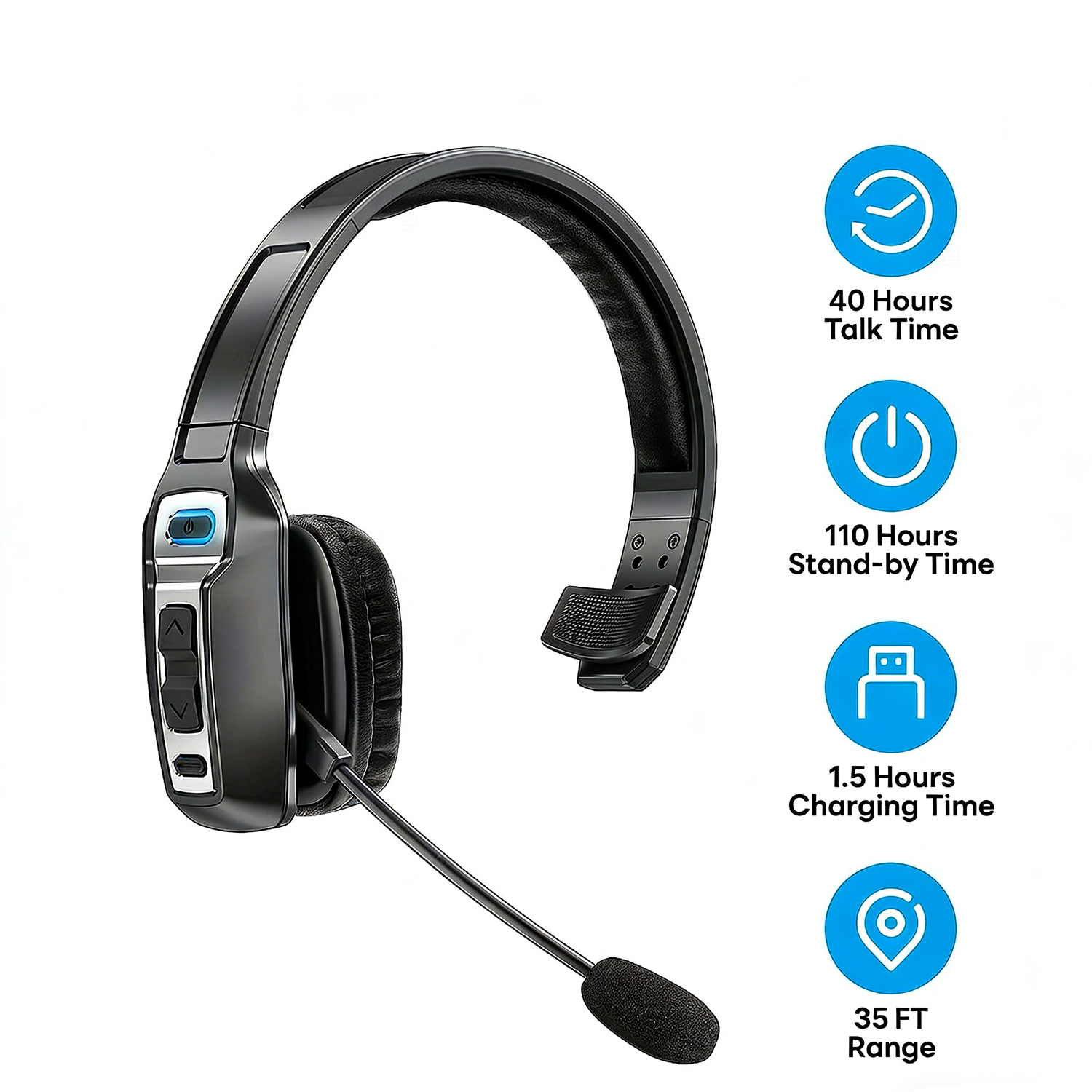 Bluetooth headset equipped with a large capacity battery, which can provide a lot of hours talking or 500 hours standby time.Your headset is fully charged within 2 hours.You can also easily block the sound on your side by pressing the mute key when needed.