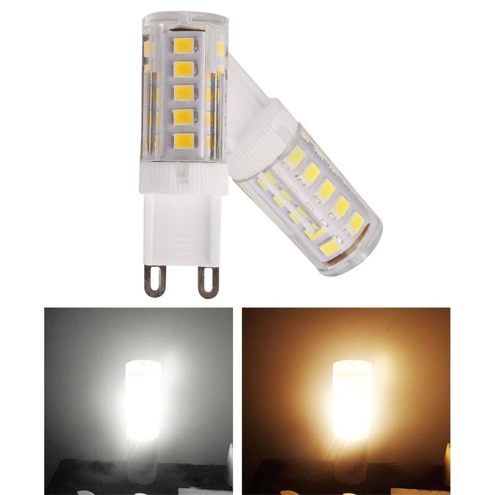 Color rendering index (CRI): > 80 Ra. Dimmable: no. Power: 5 Watt Light intensity: 450 lm. Beam angle: 121-160 degrees. Socket: standard G9 socket. Lifespan: 30,000 hours. Input voltage: 220-240V Main material: ceramic/PC Color temperature: warm white (3000 K) / cool white (6000 K) Incandescent Equivalent: 40 Watt Halogen Bulbs