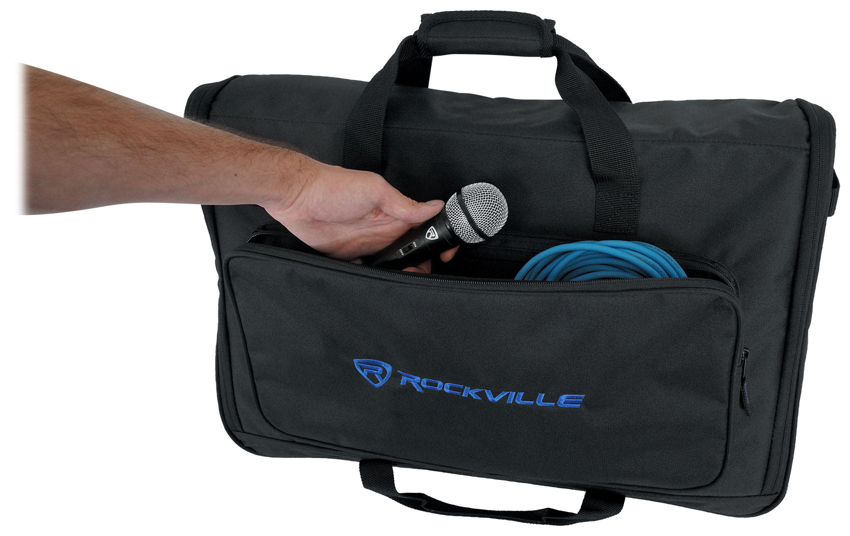 The main pocket is perfect to hold your LCD screen or mixer or other gear less than 23.5" x 15.55" x 3" The front pocket is perfect to hold cables, and other accessories.