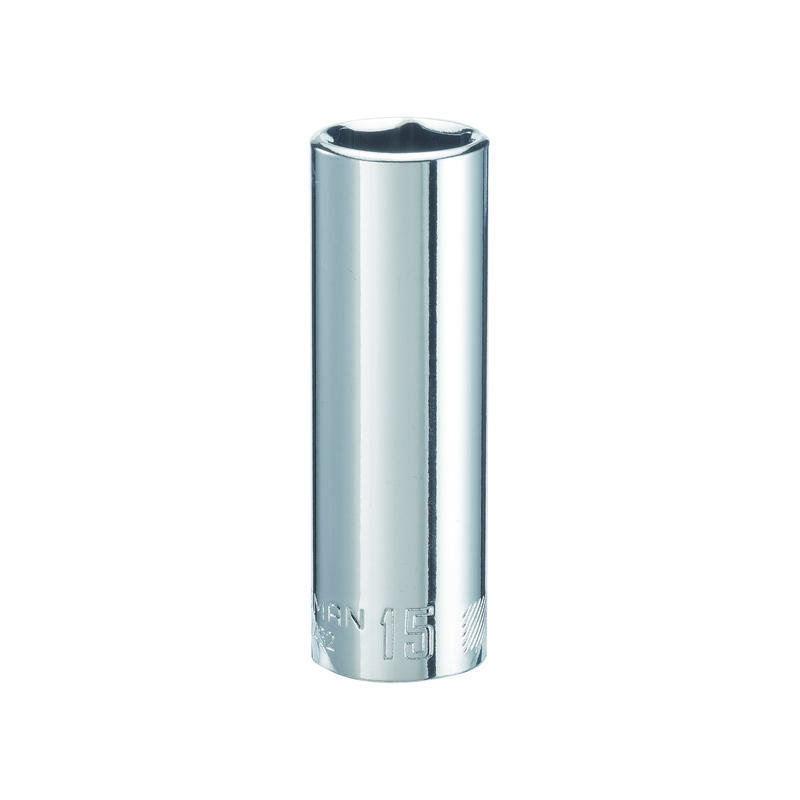 3/8-in Drive 15mm 6 Point Deep Socket features a deep well construction and internal construction designed to engage with the flats of fasteners. This allows for the user to reach those hard to reach fasteners and torque without the fear of stripping a bolt.
