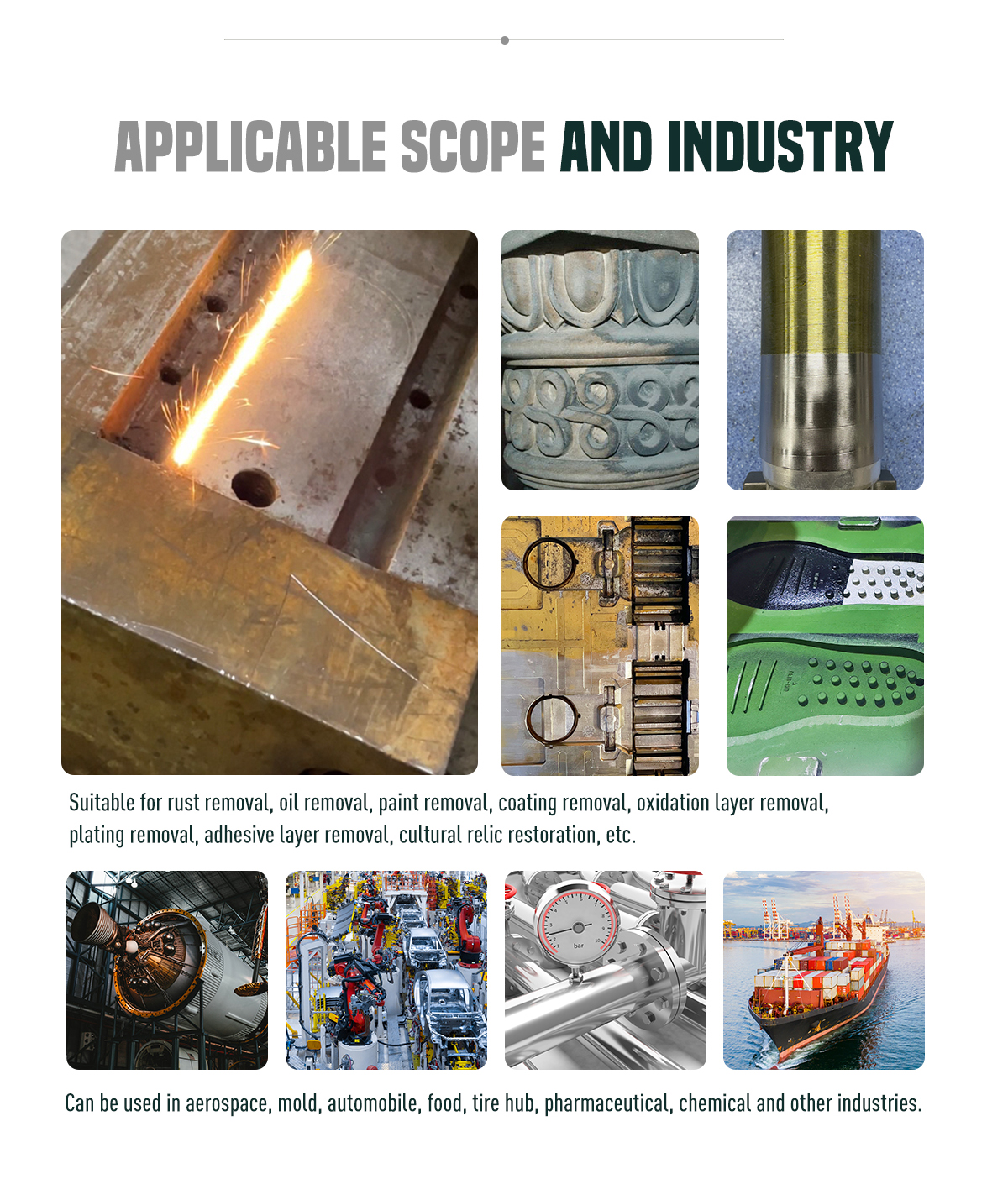The 1000w mobile laser cleaning machine pulse type is suitable for rust removal, oil removal, paint removal, coating removal, oxidation layer removal, plating removal, adhesive layer removal, cultural relic restoration, etc., it can be used in aerospace, mold, automobile, food, tire hub, pharmaceutical, chemical, and other industries.