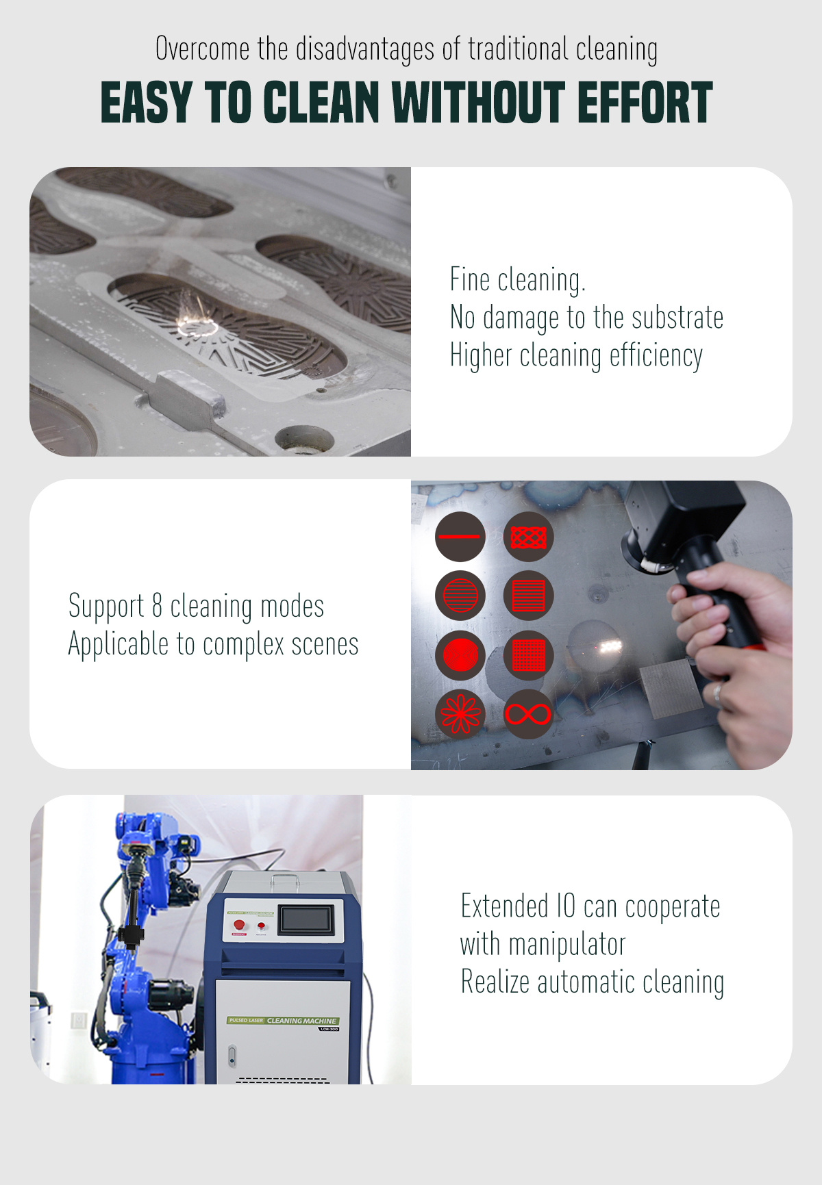 1. The pulse laser cleaning machine overcomes the disadvantages of traditional cleaning, it is easy to achieve fine cleaning without effort, and there is no damage to the substrate while achieving higher cleaning efficiency.