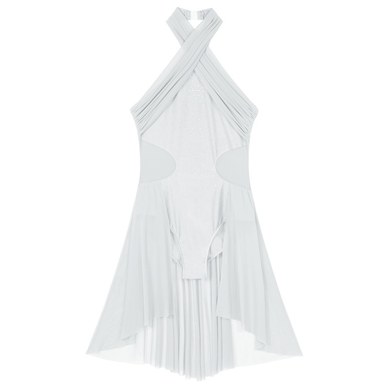 Women’s sleeveless dance dress with rhinestones that sparkle under the light to brighten up any performance.
