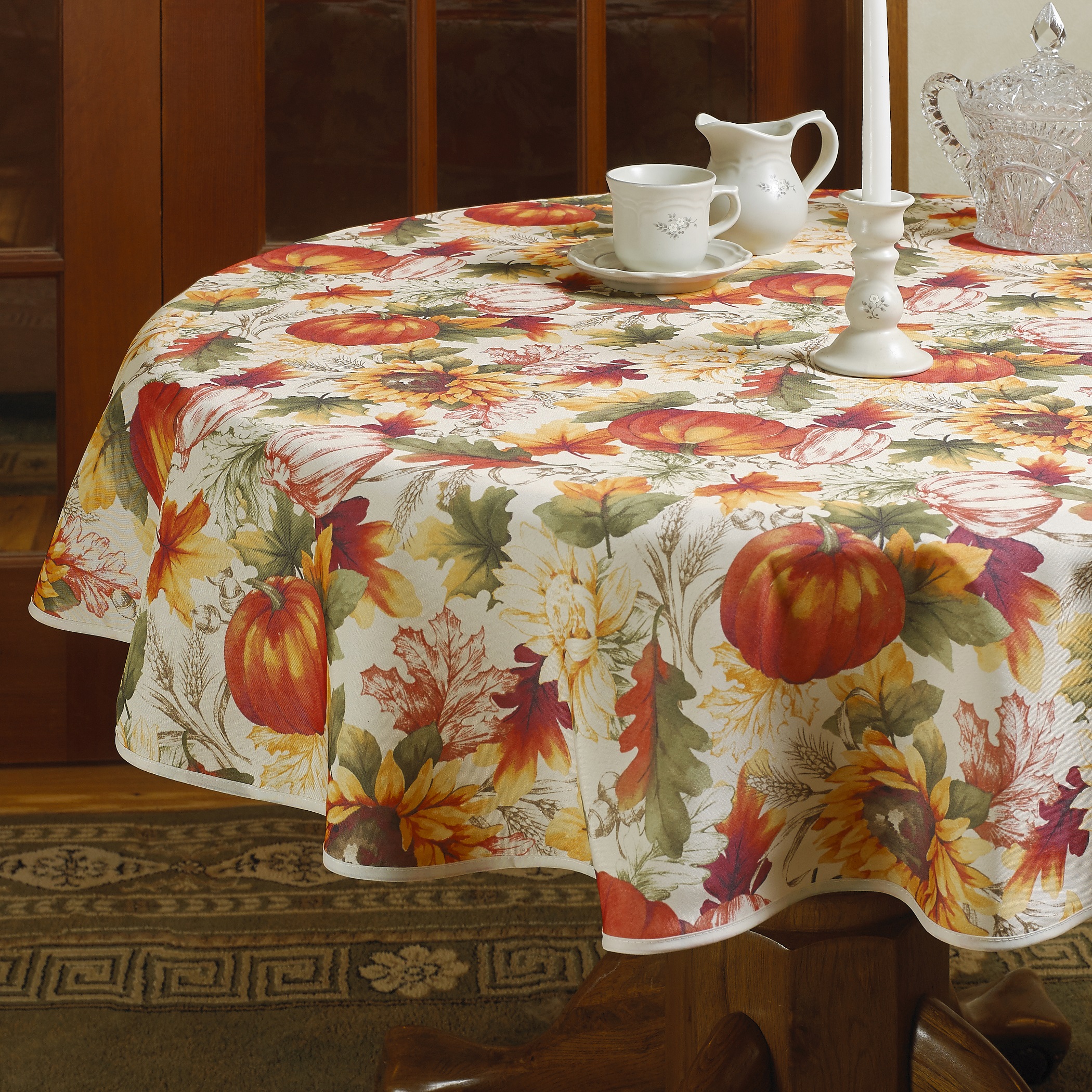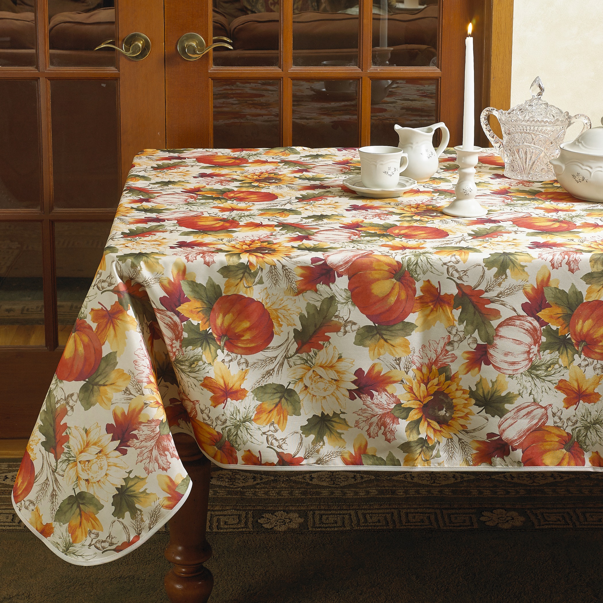 The festive pumpkin and autumn leaves tablecloth is a must just to add a touch of delight to your holiday decor.