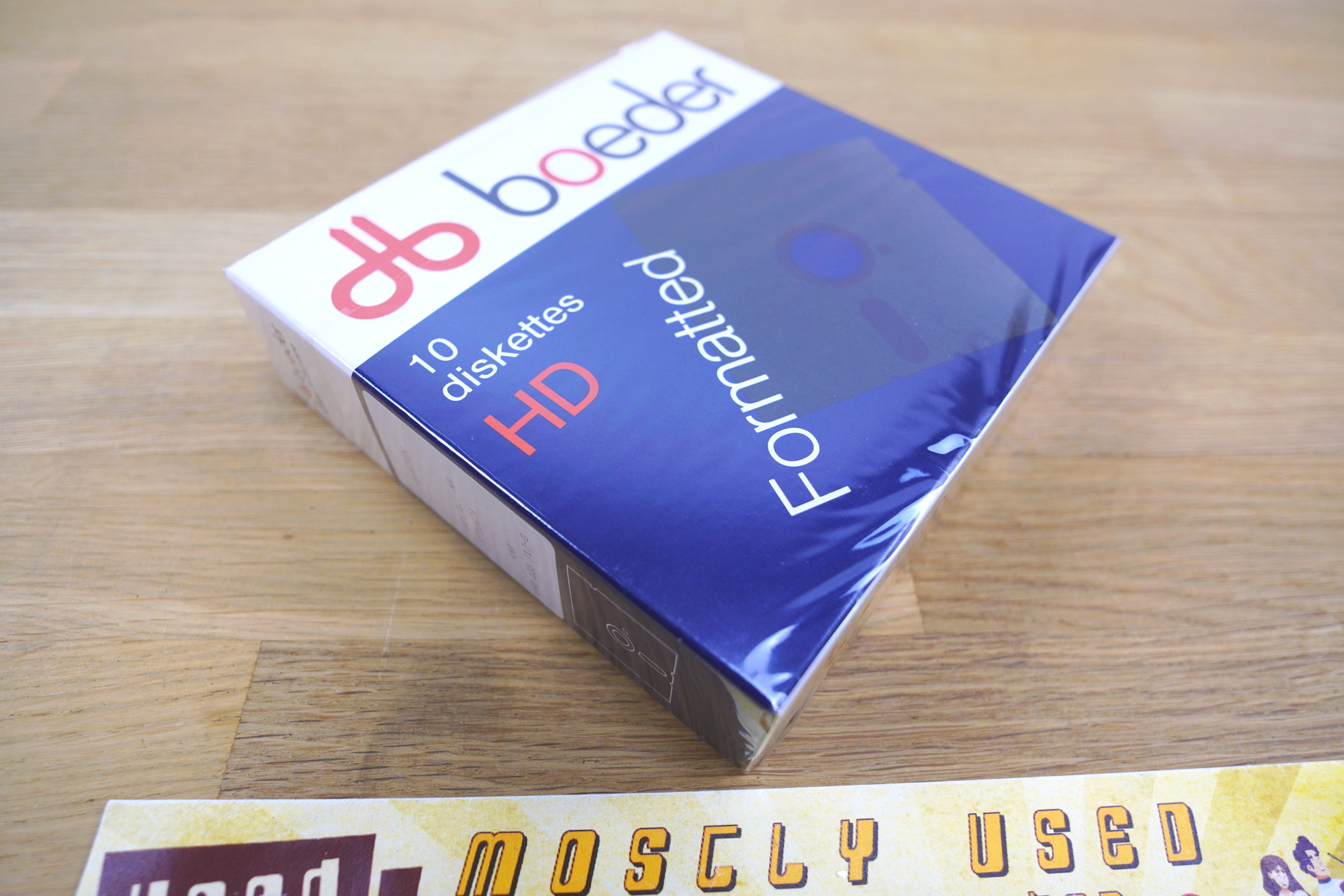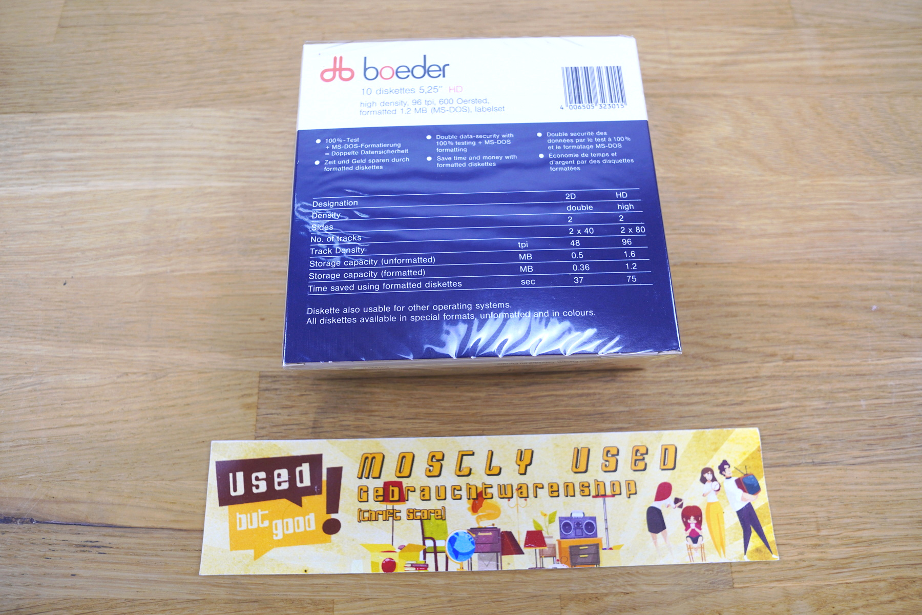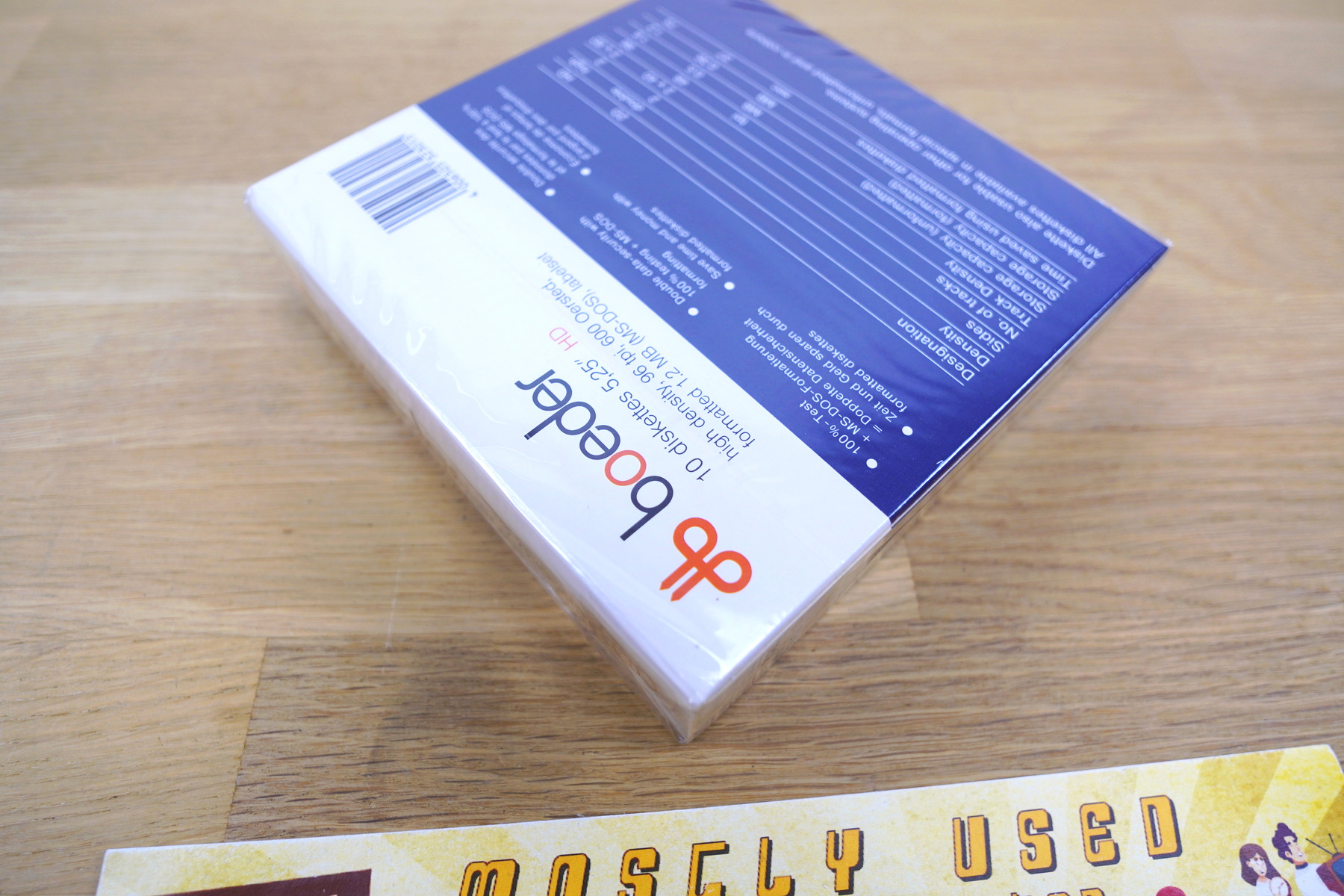 An unopened pack of 10 5.25" blank and for MS-DOS formatted floppy disks from the brand "BOEDER" with a storage capacity of 1.2 MB in original packaging.