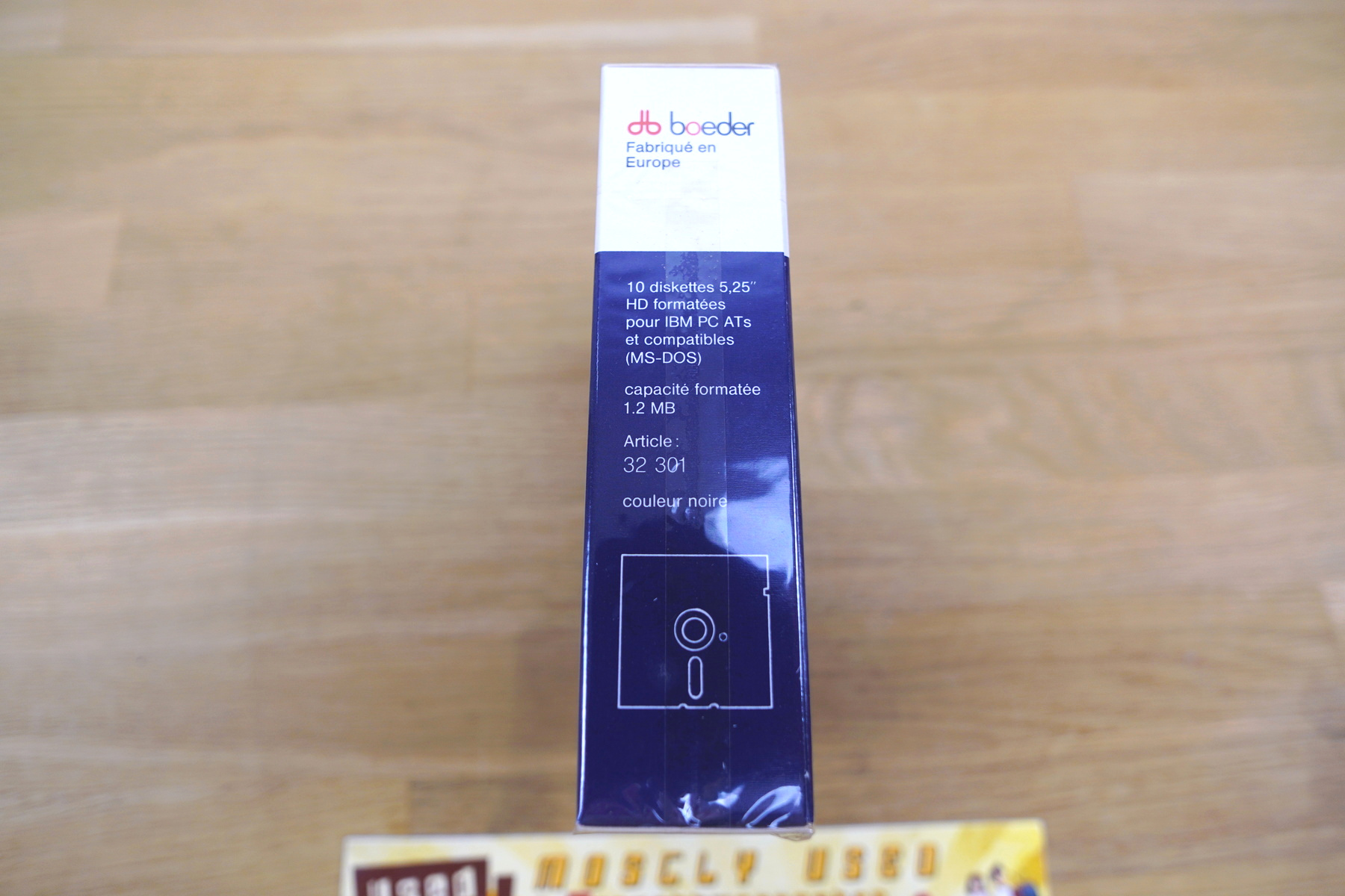Eine ungeöffnete 10 Stück Packung von 5.25" für MS-DOS formattierten Leerdisketten der Marke "BOEDER" mit einer Speicherkapazität von 1,2 MB in original Verpackung.