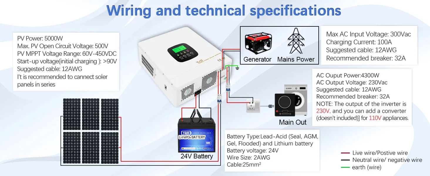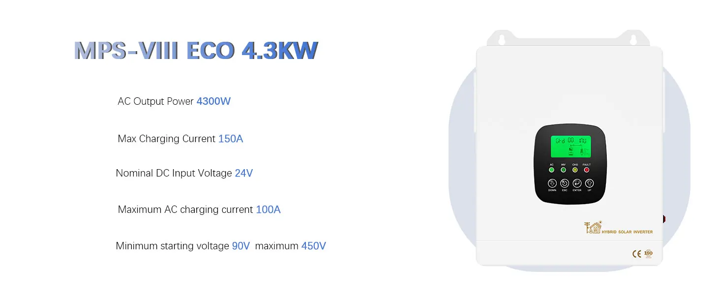 【PURE SINE WAVE INVERTER】4300W Off Grid Solar Inverter 24V Built-in 150A MPPT Charge Controller, Pure Sine Wave Inverter Single-phase output 230VAC, 4.3kw new all-in-one inverter combining functions of inverter, solar charger and battery charger to offer uninterruptible power support in a single package.