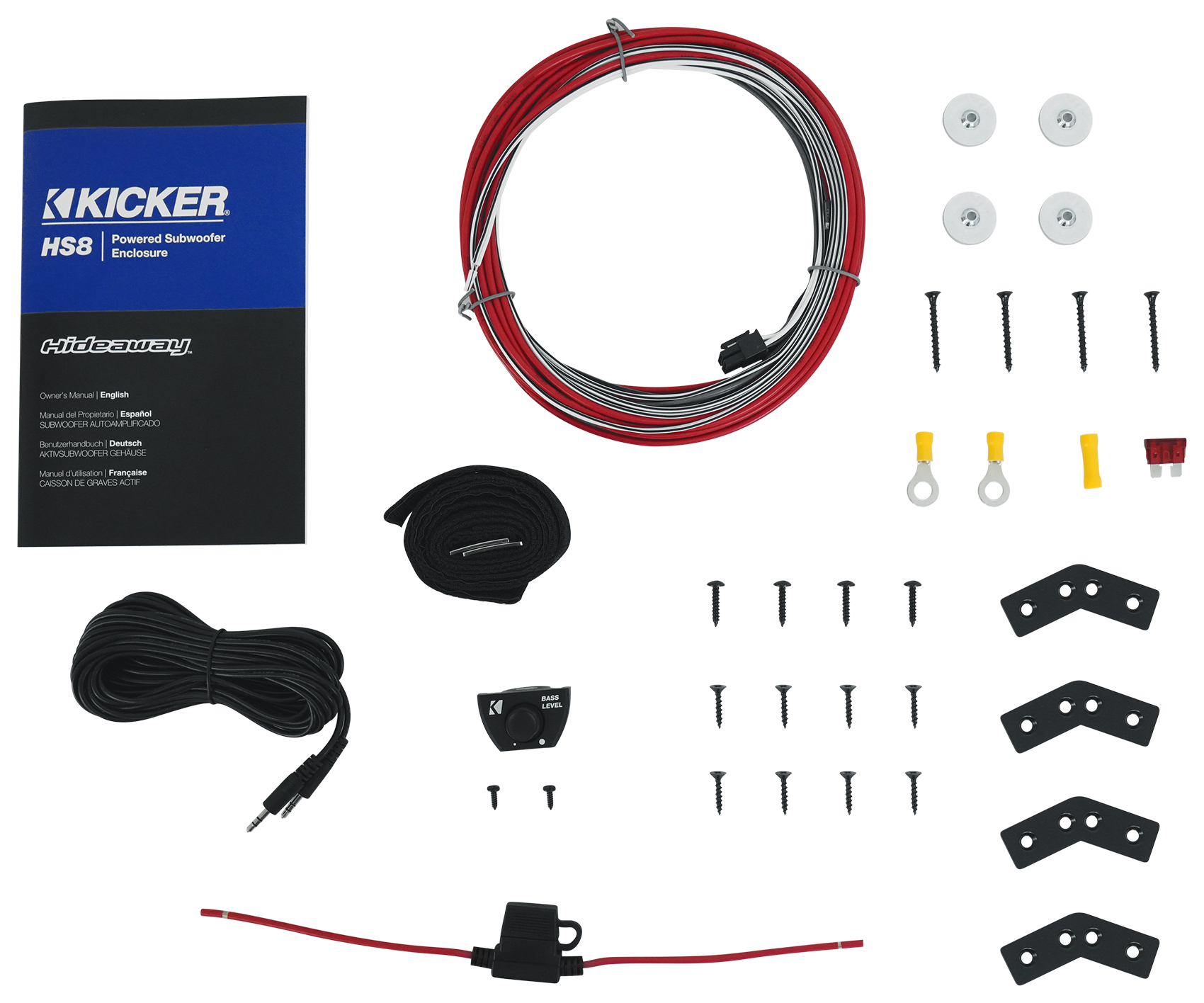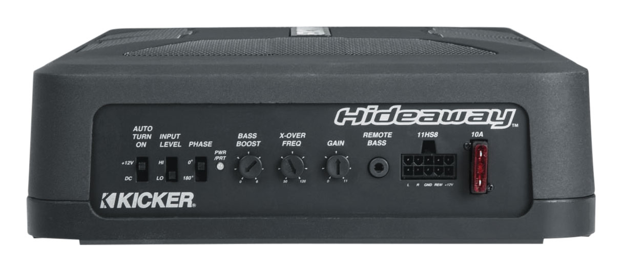 The quick-connect Molex® plug and harness entails power, signal and remote turn-on. The Hideaway comes with a remote bass control for fine-tuning bass levels, adjustable low-pass crossover, variable +6dB bass boost, phase-cancelling switch for max output and two automatic turn-on options. It also features high- and low-level inputs for integration with nearly any factory or aftermarket head unit.