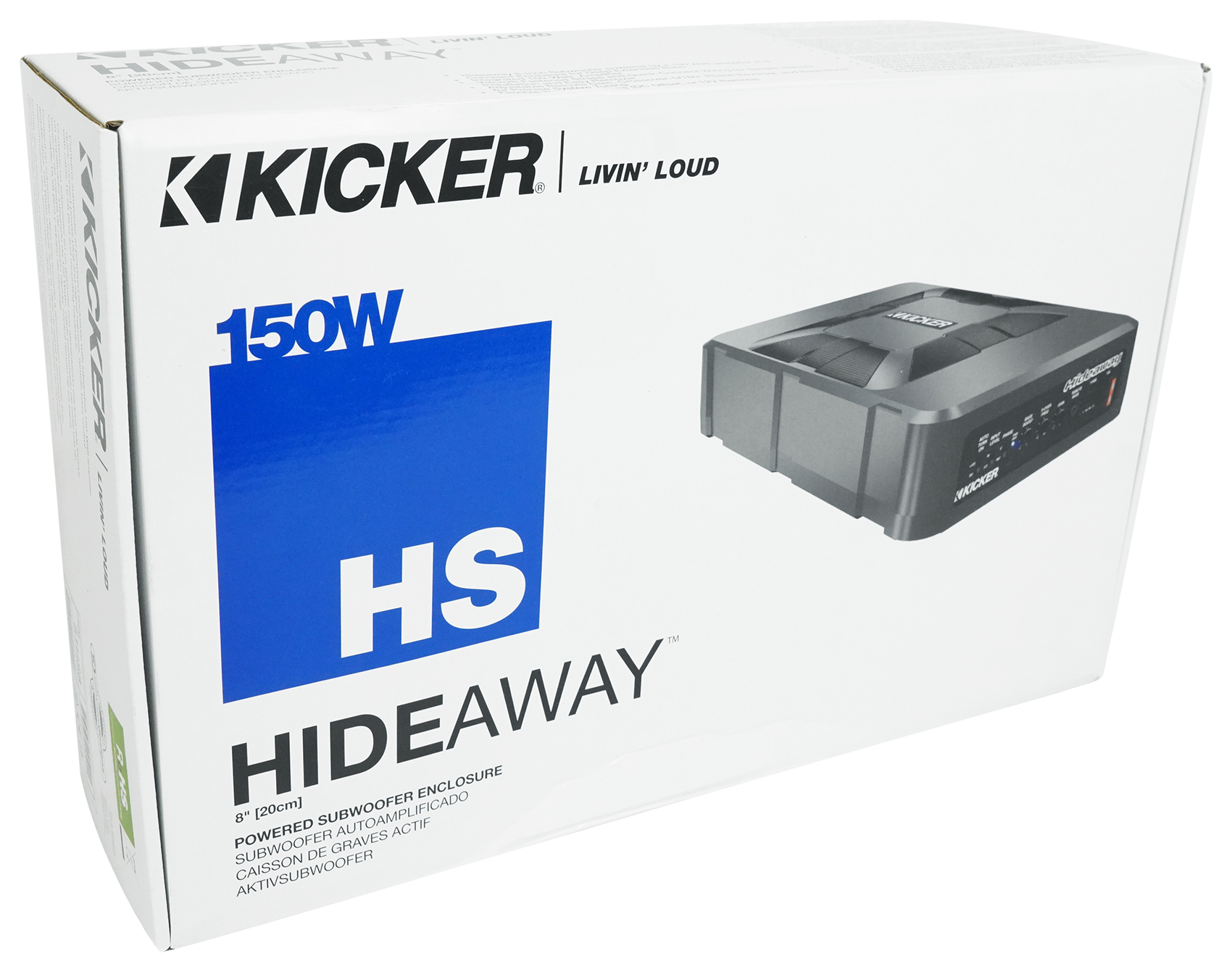 The KICKER Hideaway Compact Powered Subwoofer delivers surprising low frequency output from a remarkably small enclosure, setting a new standard in plug-and-play bass performance and convenience in a vehicle. At just over three inches high and nearly 14 inches long, the Hideaway combines a 150-watt amplifier and an 8-inch subwoofer to add thumping bass to any vehicle from the tightest locations. It also provides a quick-connect power plug and Velcro®-fastened nylon straps for secure installation and simple but fast removal.