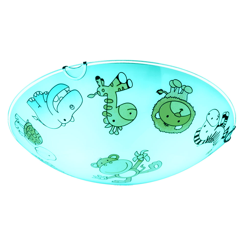 • Lampentyp: Deckenleuchte • Lampenschirm: Glas weiß mit Kinderdekor • Motiv: Tiere • Farbe: Bunt • Schutzart: IP20 • Schutzklasse: 1 • Durchmesser x Höhe in cm: 30 x 6,5